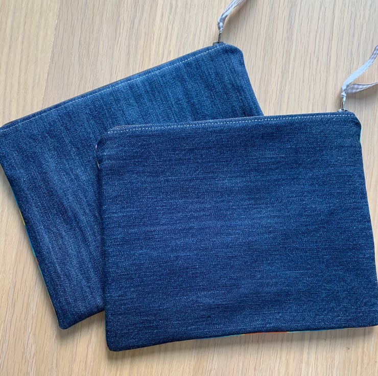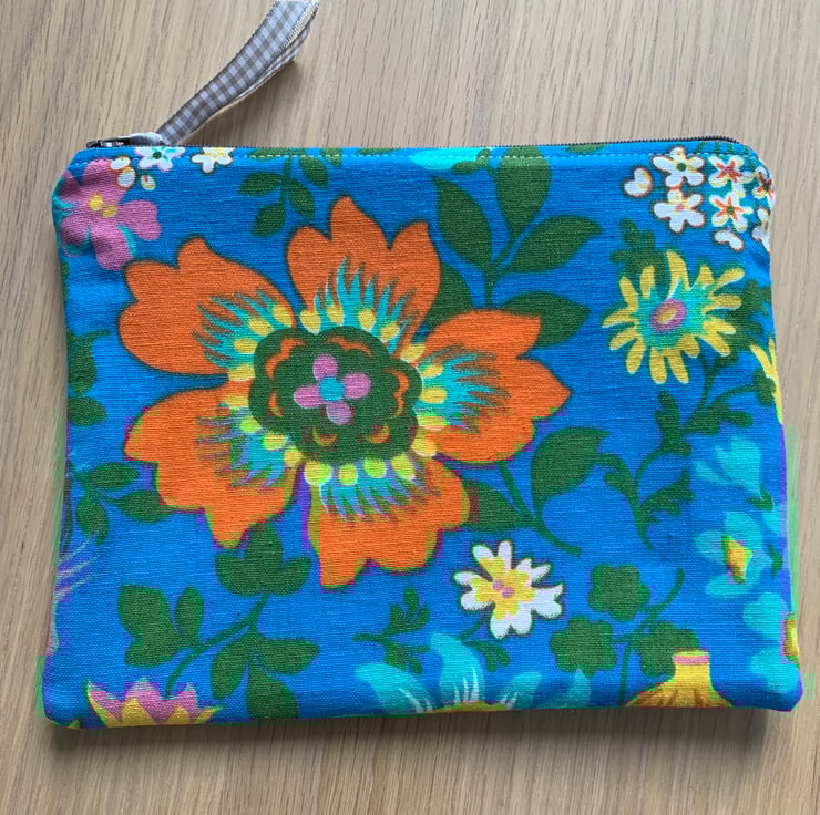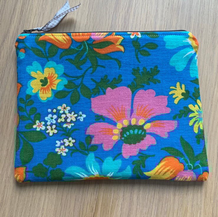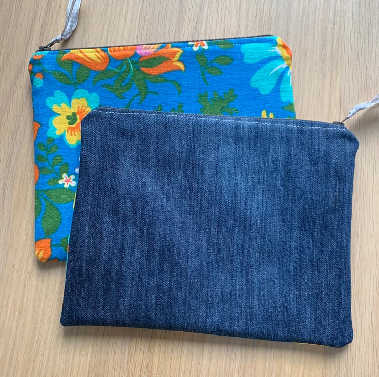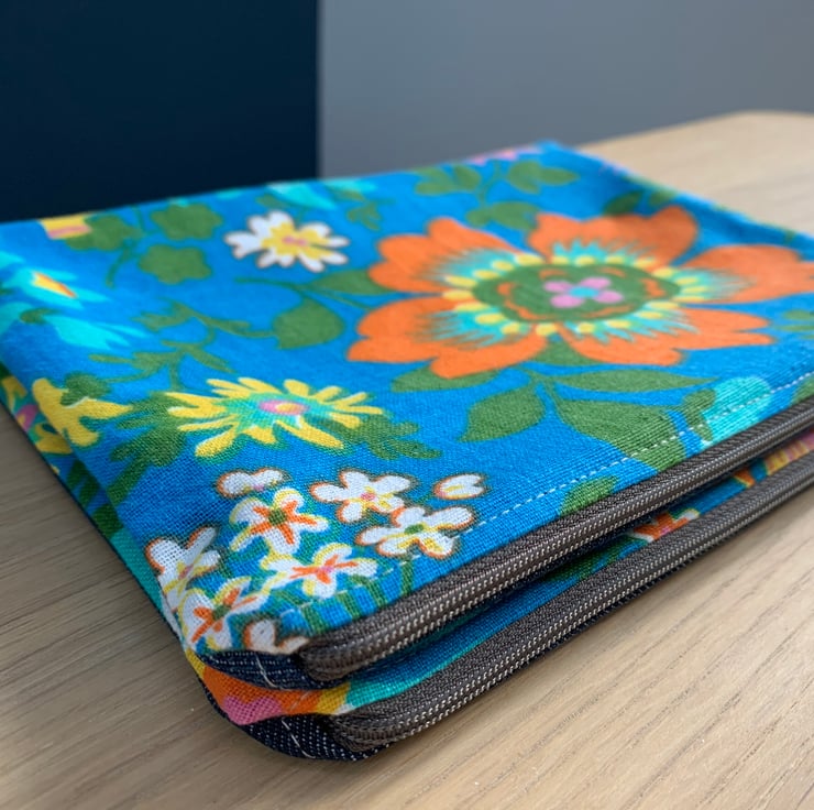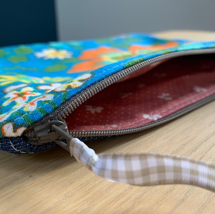 Colourful floral zip pouch in reclaimed vintage fabric, backed with denim from old jeans. The bag is fully lined with pink vintage cotton with a sprig pattern.