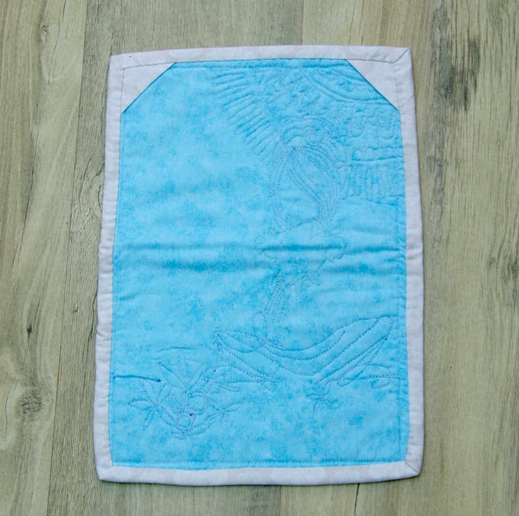 The quilt is approximately 36.5cm (15 inches) by 27.5cm (11 inches) and has small triangular tags so it can be hung on the wall.