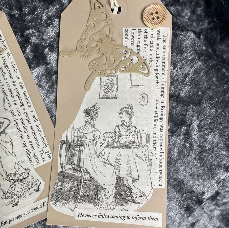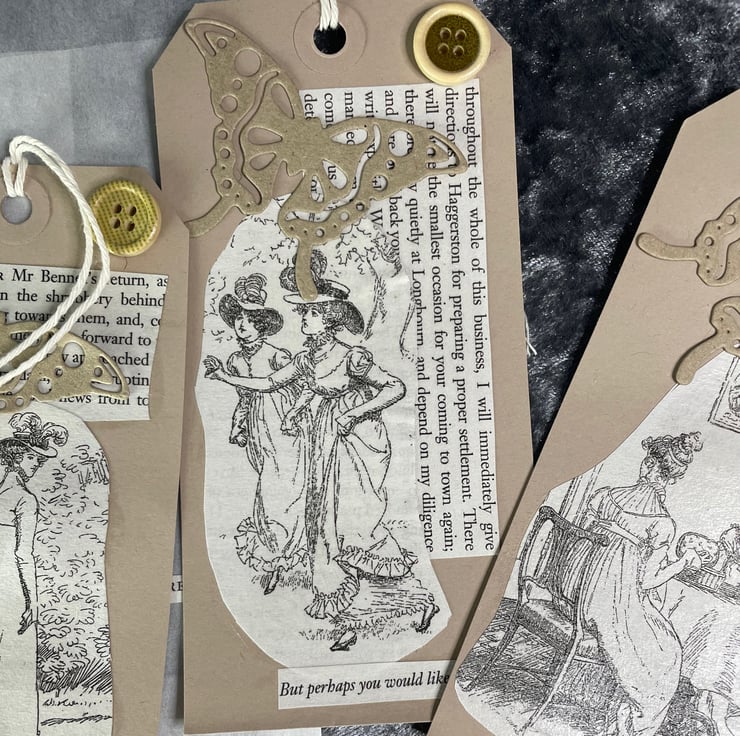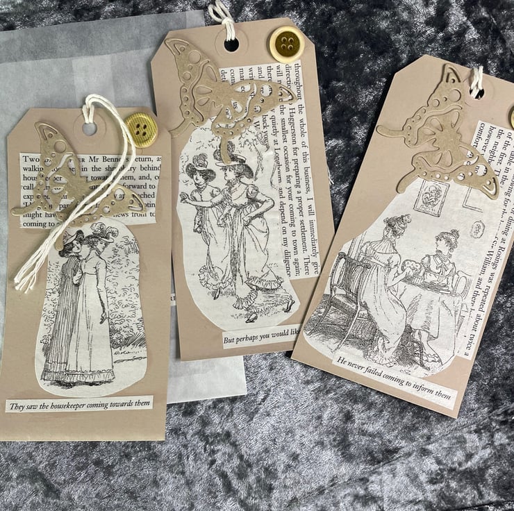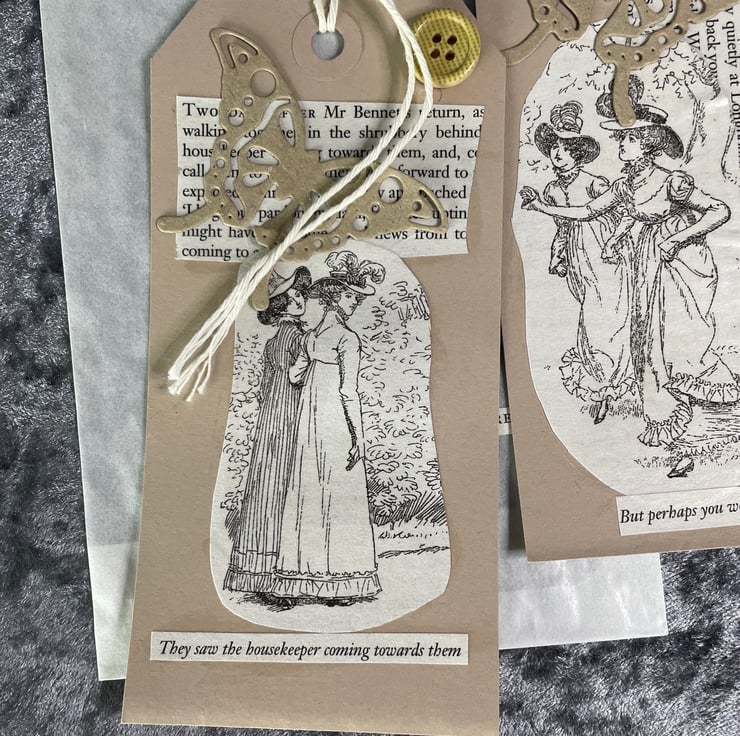 A set of kraft card gift tags made form images from the book Pride & Prejudice by Jane Austen, along with an exert from the pages plus the comment applicable to the plates. Button and kraft card butterfly for embellishment. String for tying. Come in a glassine bag with 'Pride and Prejudice' wording plus a rose and leaf image in Autumnal colours.