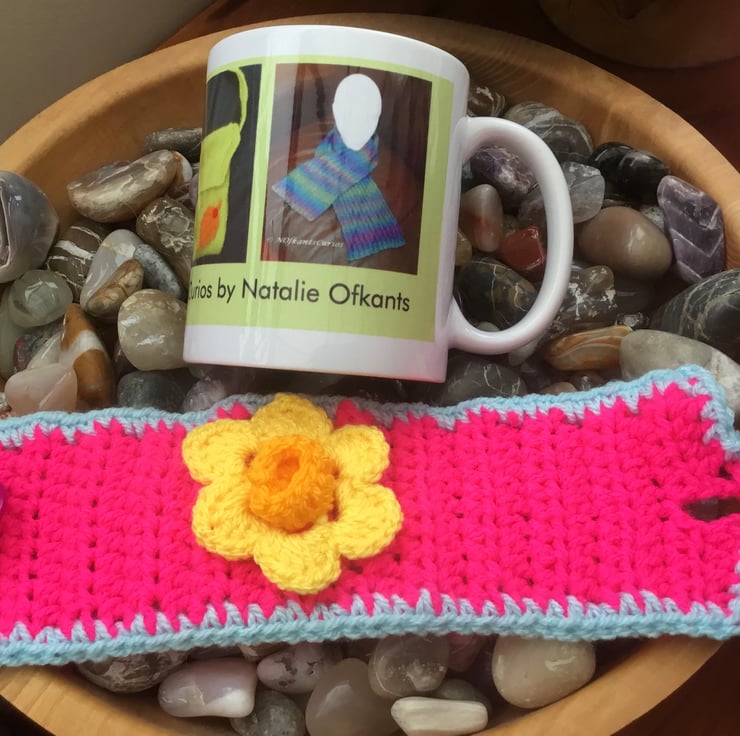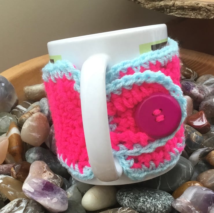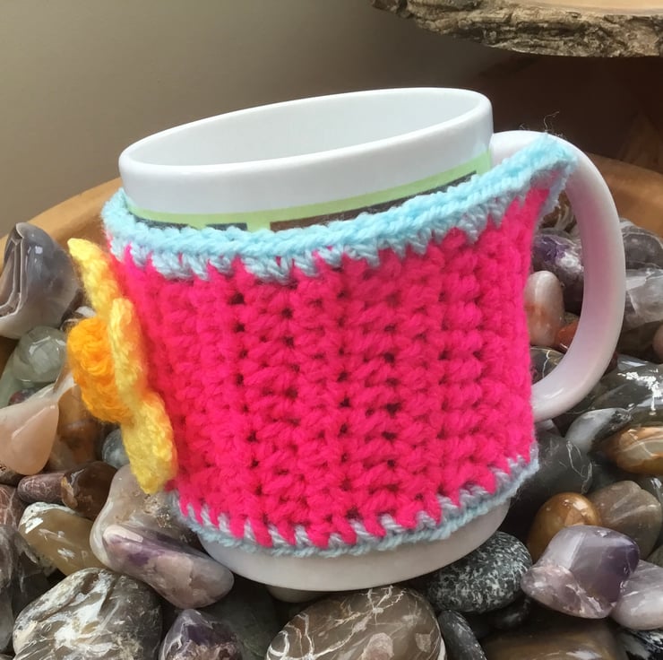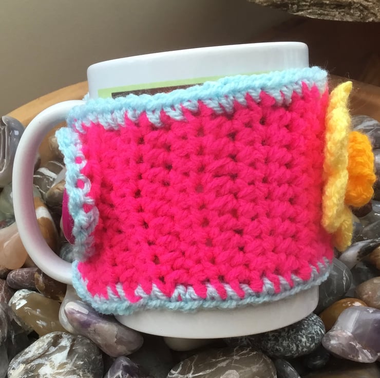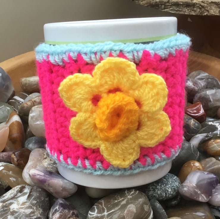 Vibrant Daffodil Mug Cosy, crocheted in a BRIGHT pink acrylic yarn and trimmed in sky blue yarn and featuring a crocheted golden yellow daffodil, inspired by looking forward to spring and fastened with deep pink coat button.