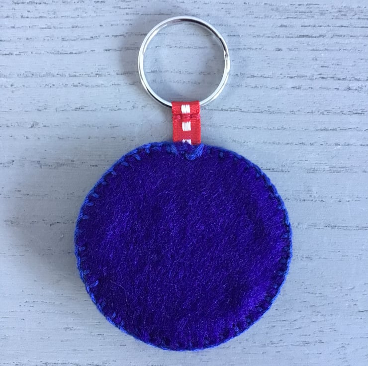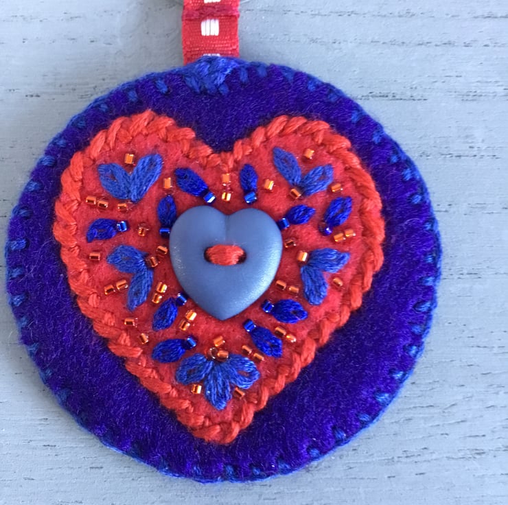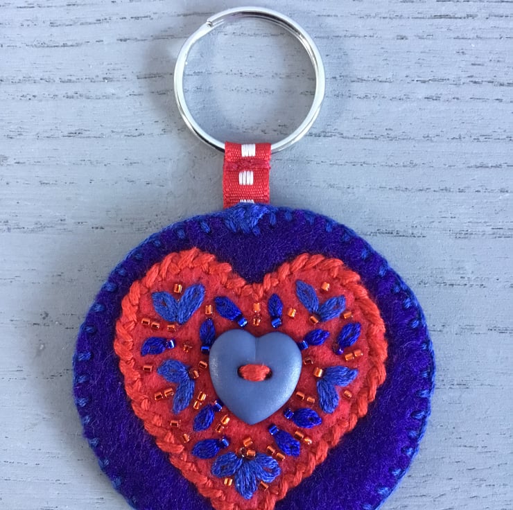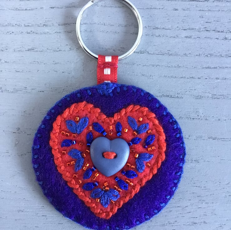 This circular felt Embroidered Blue Heart Keyring or Bag Charm has a blue heart shaped button stitched onto a red felt heart shape. This heart is filled with hand embroidered Lazy-Daisy Stitches with red and blue seed beads, edged with hand embroidered Blanket Stitches in blue thread. At the top, a red ribbon is stitched onto a metal split ring. So a key can be attached as a Keyring or to accessorise a bag as a Bag Charm.