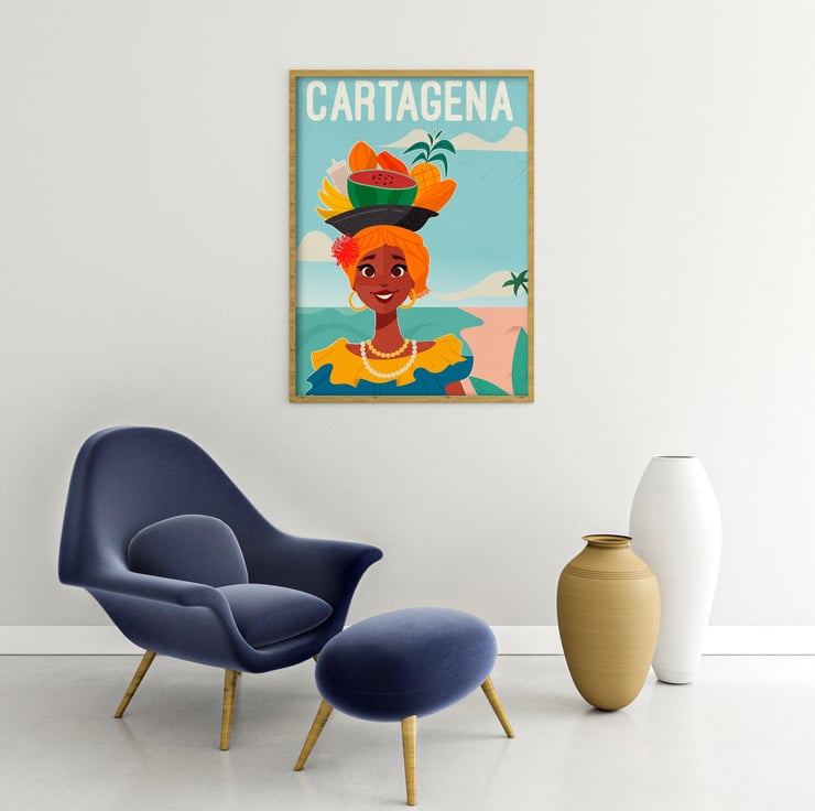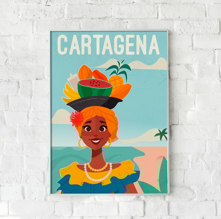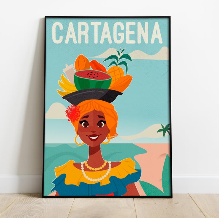 Cartagena retro travel poster, Colombian girl retro print, Colombia wall art