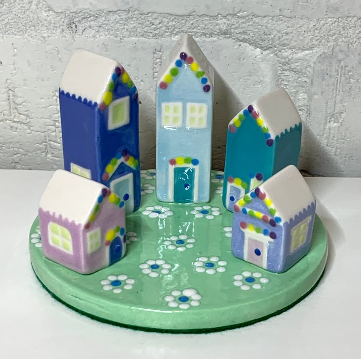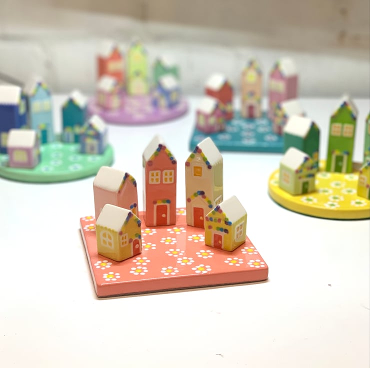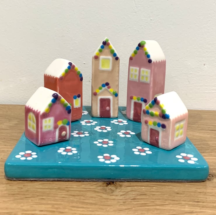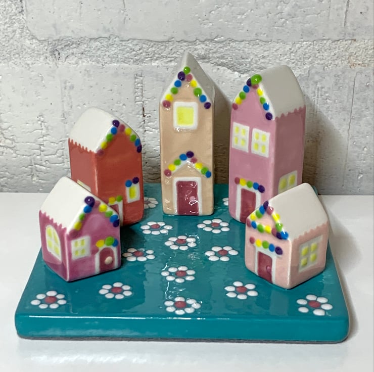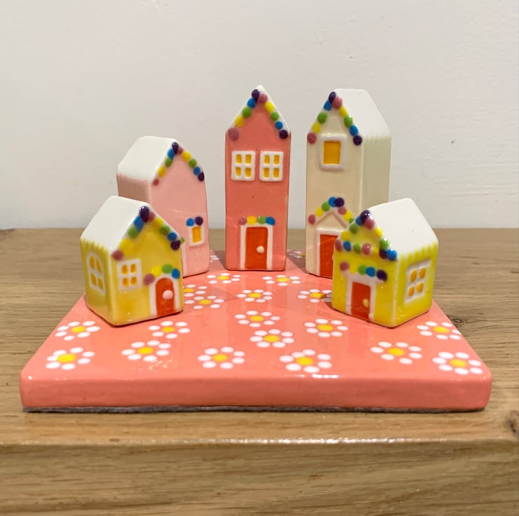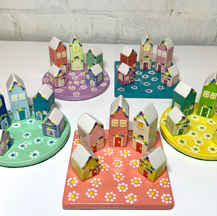 These five earthenware ceramic houses have each been individually hand painted using a range of colourful, pastel underglaze paints. A scattering of daisies created with simple white dots and coloured centres have been painted with a bumpy paint that sits on the surface for a slight 3D effect.
