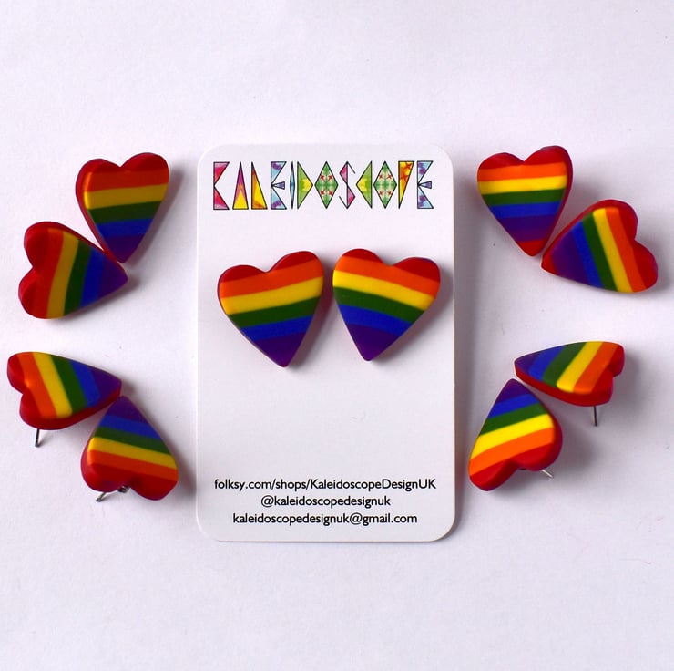 Heart-shaped, polymer clay rainbow earrings with nickel plated post and scroll