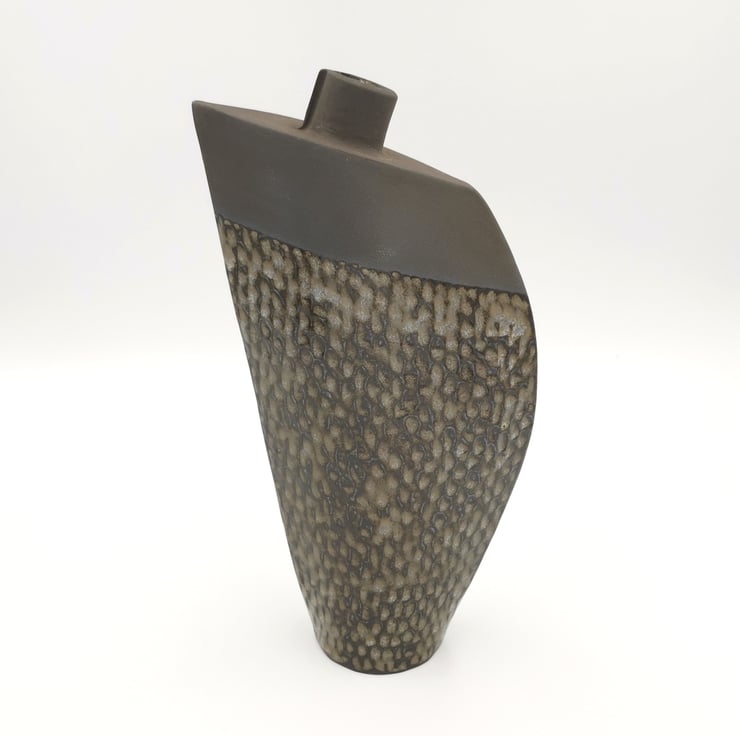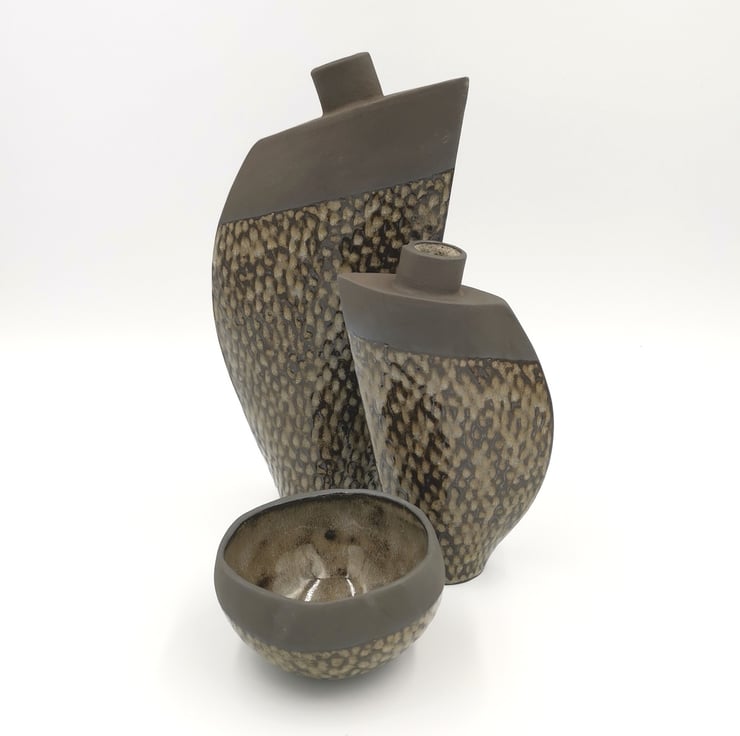 Slab built vases in a dark brown stoneware clay with a grey/brown glaze.