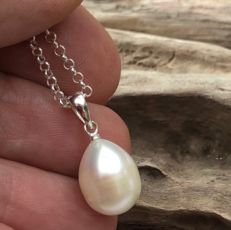 14x10mm oval white freshwater pearl set on a sterling silver pendant drop on a 16' solid silver mini-bell chain