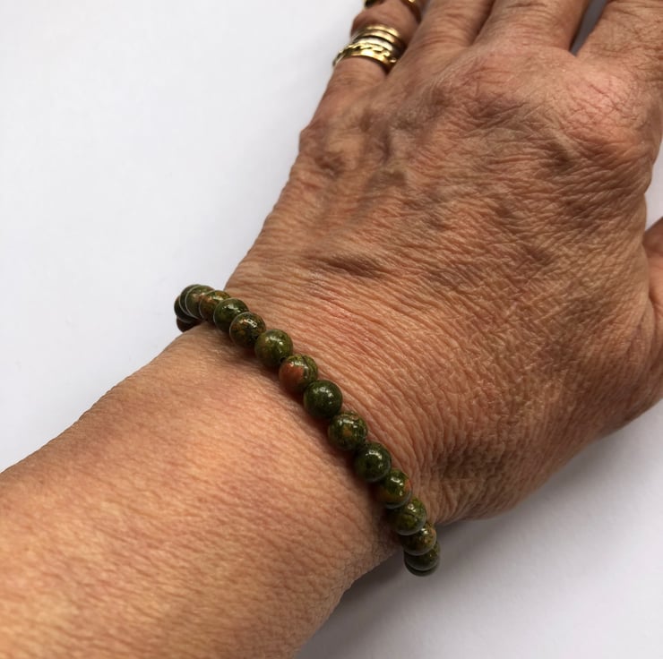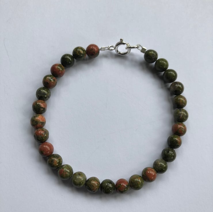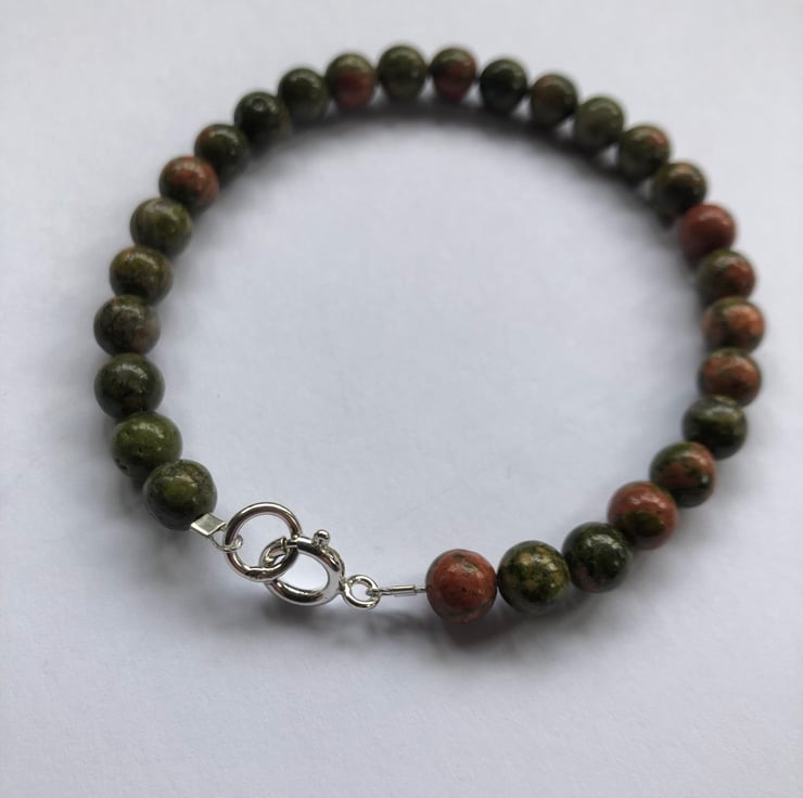 6mm round unakite beads threaded on wire with a solid sterling silver 8mm bolt ring and jump ring fastener.