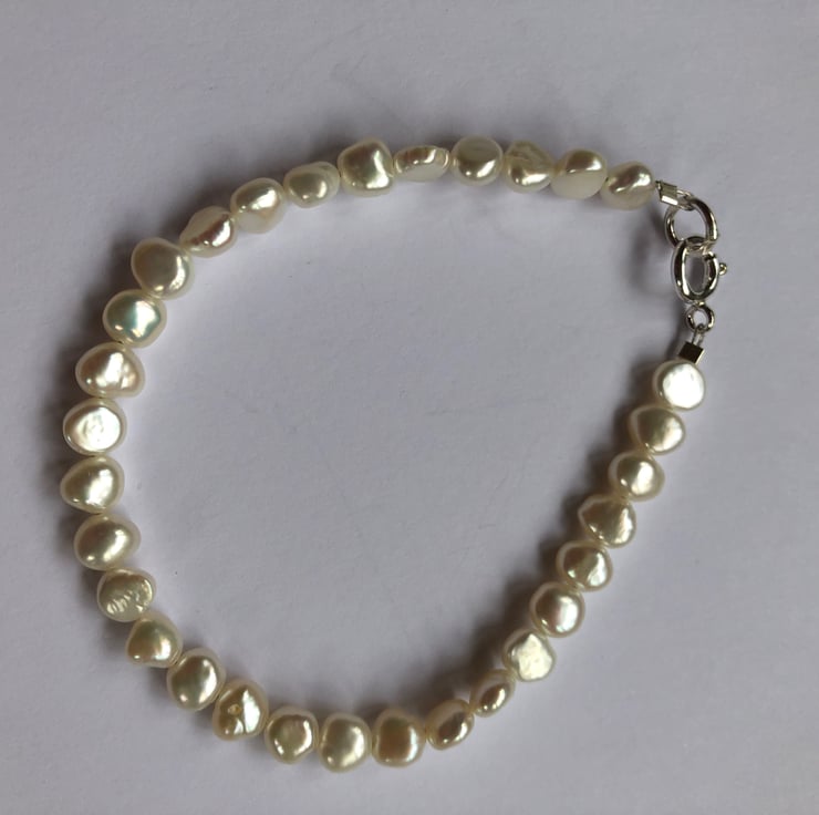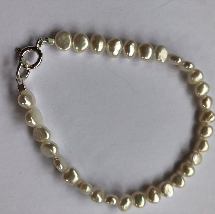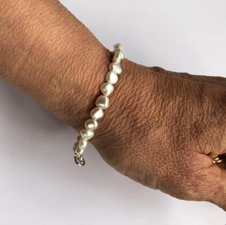 6mm irregular baroque shaped white freshwater pearls threaded on wire to a solid sterling silver 8mm bolt ring and jump ring.
