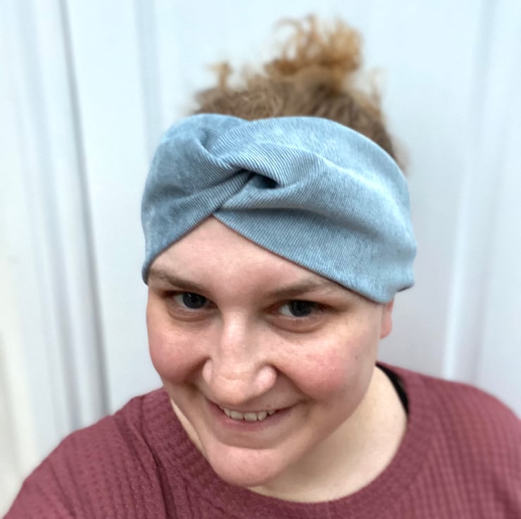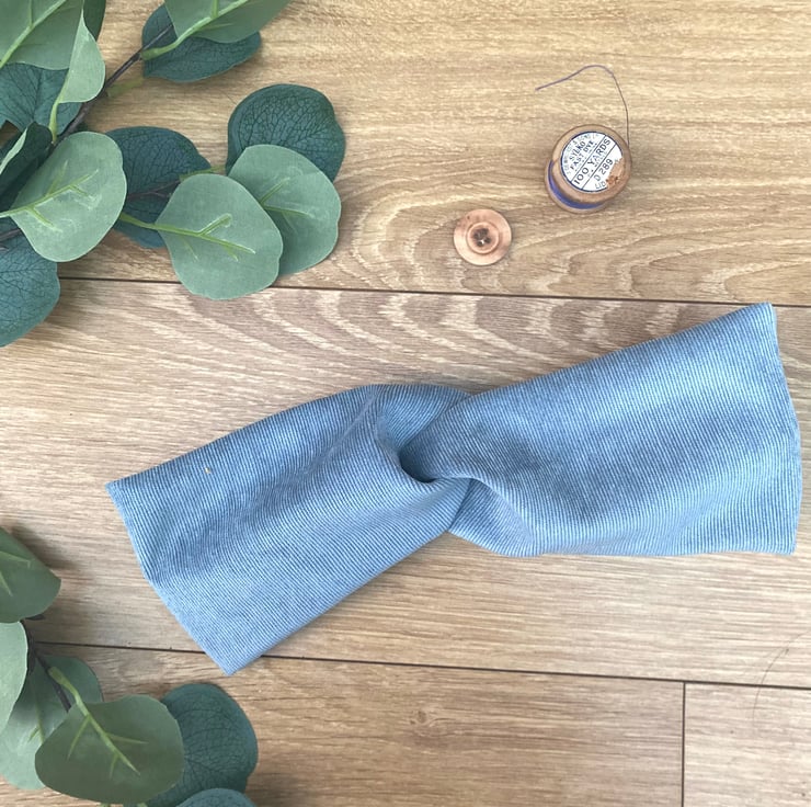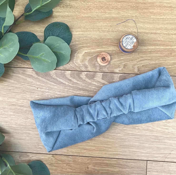 Handmade from 100% cotton a beautifully soft Baby Cord in a blue/grey Colour with a Knot at the front.