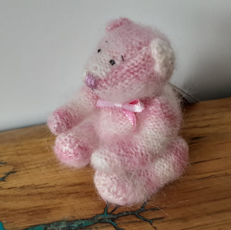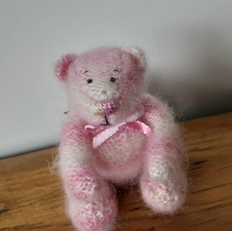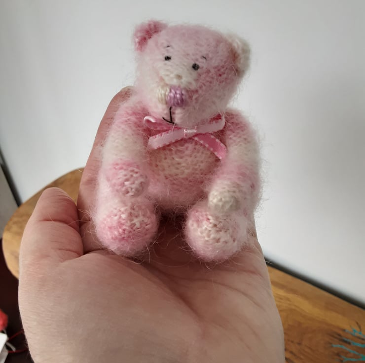 His face is hand embroidered using black thread for eyes and mouth and verigated perle cotton thread in pink and lilac for his nose.