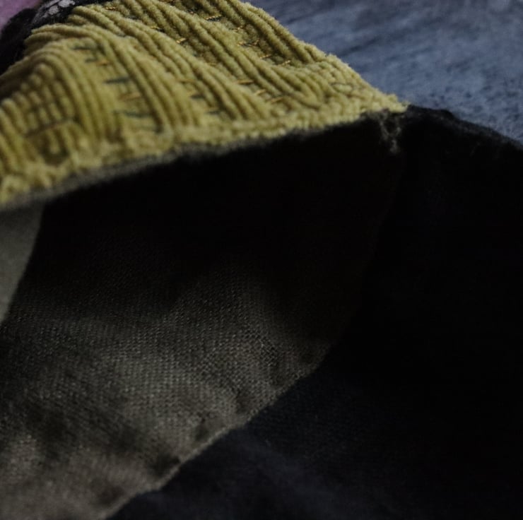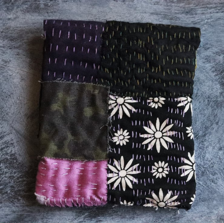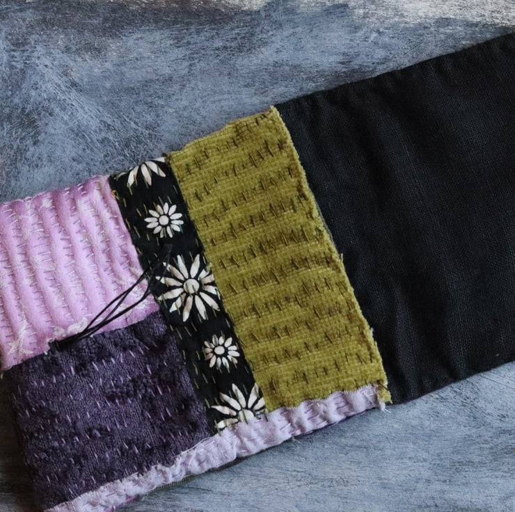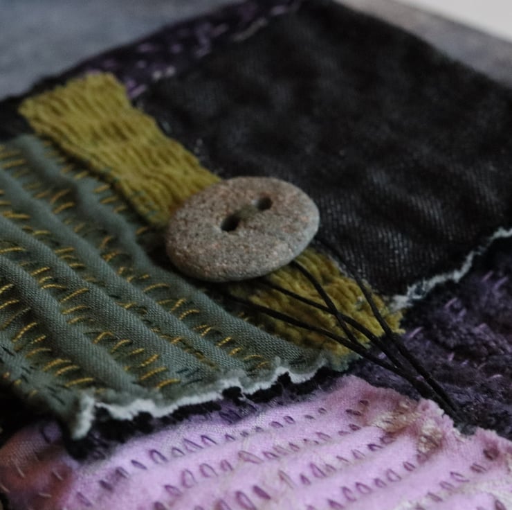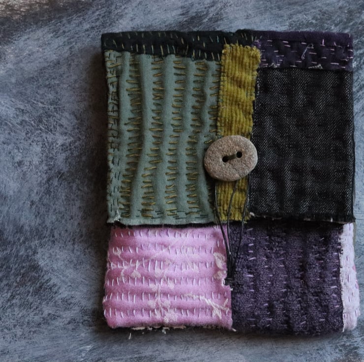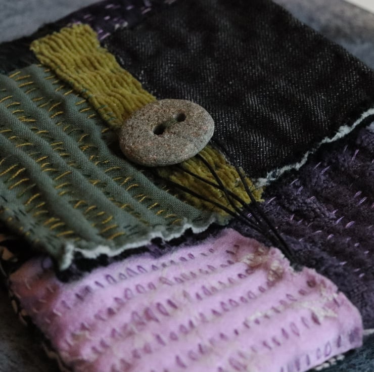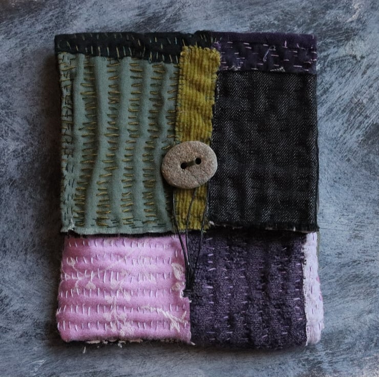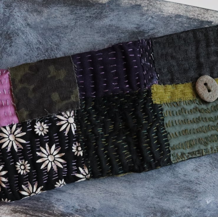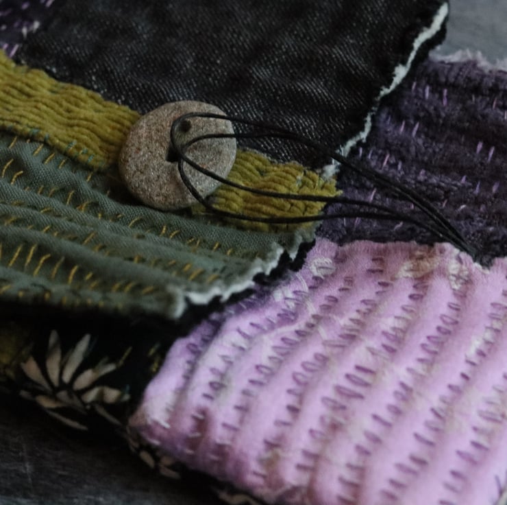 a scrappy little cloth pouch. made from bits of pre-loved fabric, slowstiched into a soft textured cloth. lined with pieces of black, and a khaki green linen. with a seaworn pebble button & waxed linen thread, fastener.