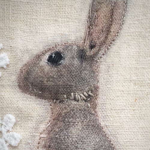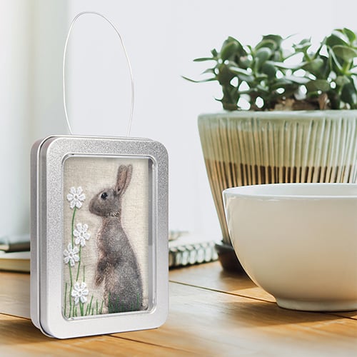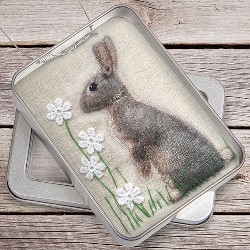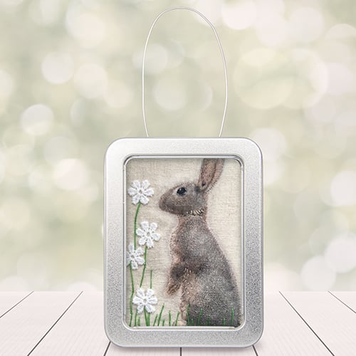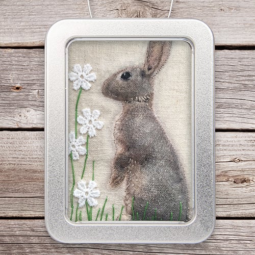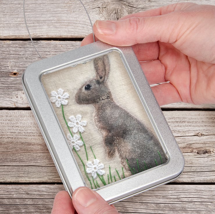 fabric rabbit (large tin) - hand embellished, textile print - stitched and framed in a tin, with a loop to hang it up