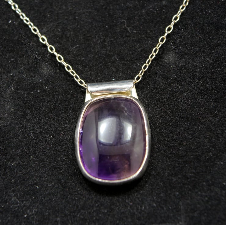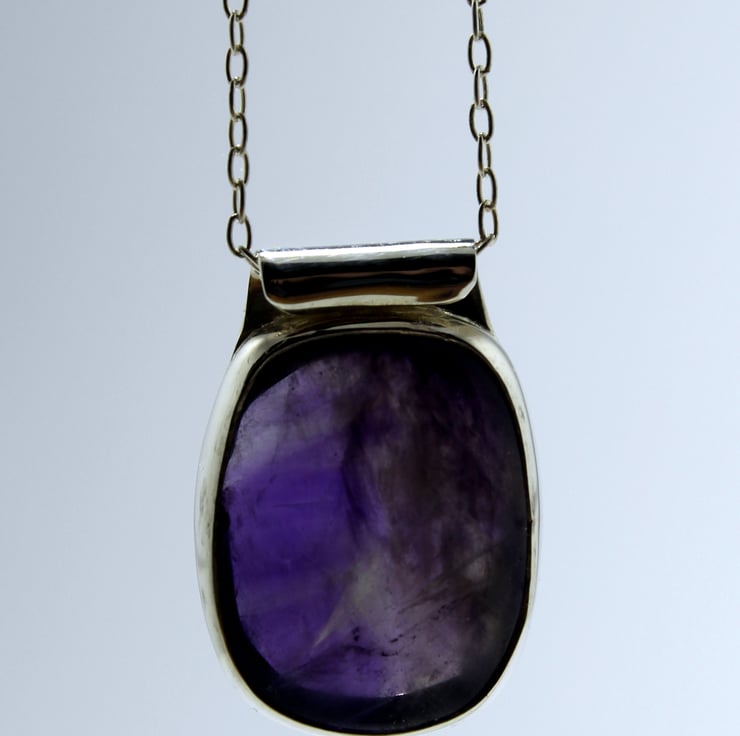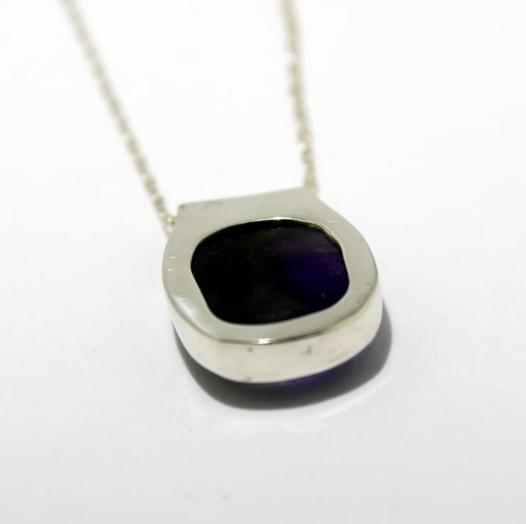 Classic understated Amethyst, Fine and Sterling Silver pendant. A translucent purple Amethyst Jewell in a fine silver surround and Sterling Silver open backplate, which allows light to penetrate the amethyst displaying its beautiful colours. Complete with Sterling Silver Trace chain (16inch/40cm).
