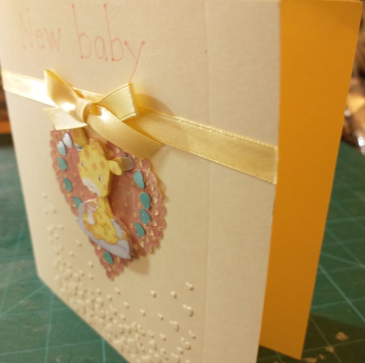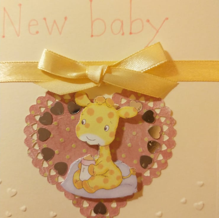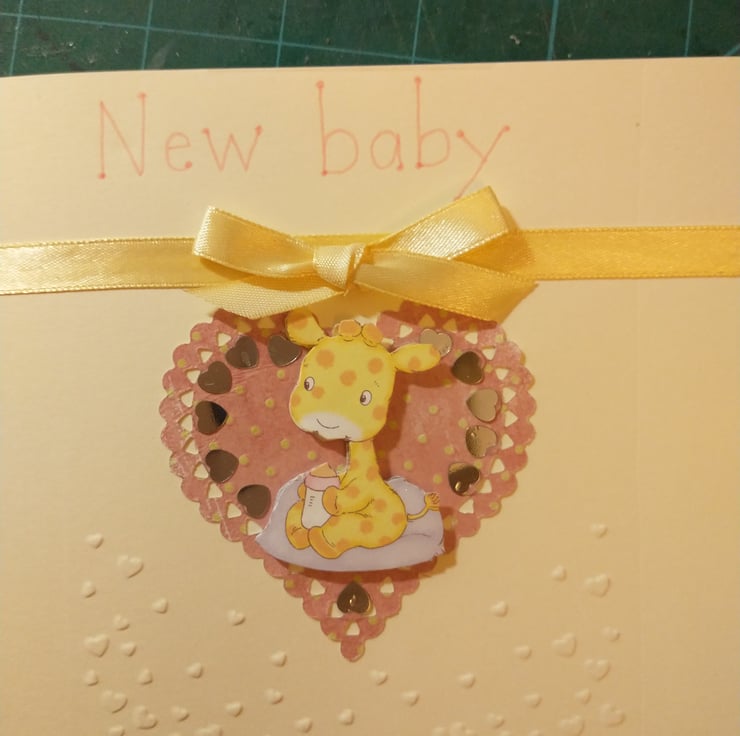 A completely handmade and uniquely designed card. Consisting of quality cream card which has been embossed with a flurry of hearts. A cute giraffe decoupage mounted on to a peach, cream heart. The heart surrounded by silver hearts. New baby hand written in peach ink. Finished off with a lemon ribbon and bow