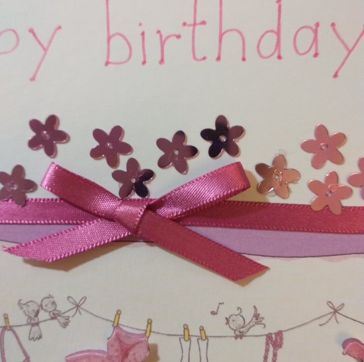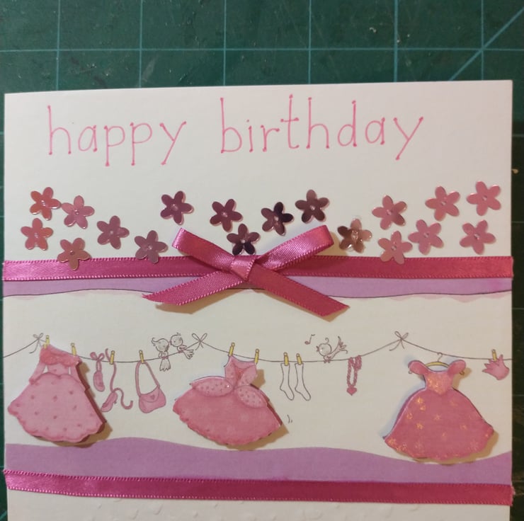A completely handmade and uniquely designed card. Consisting of quality pristine white card which has been embossed with a flurry of hearts. A washing line full of princesses dresses decoupage. Edged with pink ribbon and bow. Happy birthday hand written in pink ink. Finished off with pink flower sequins