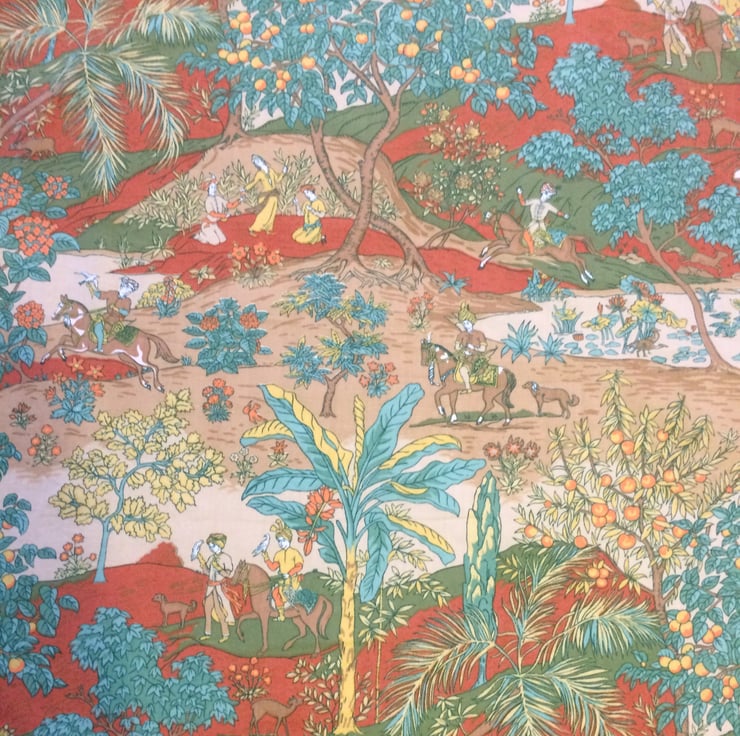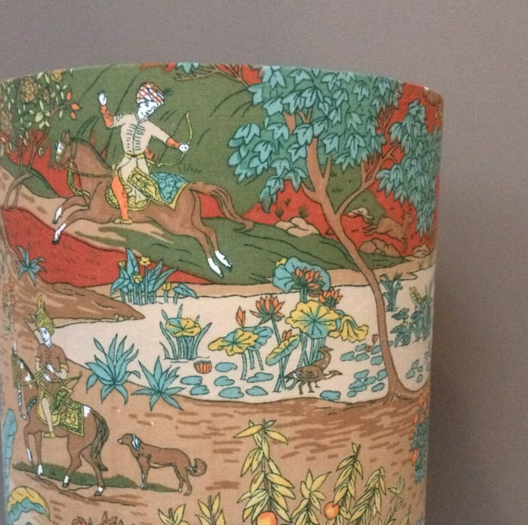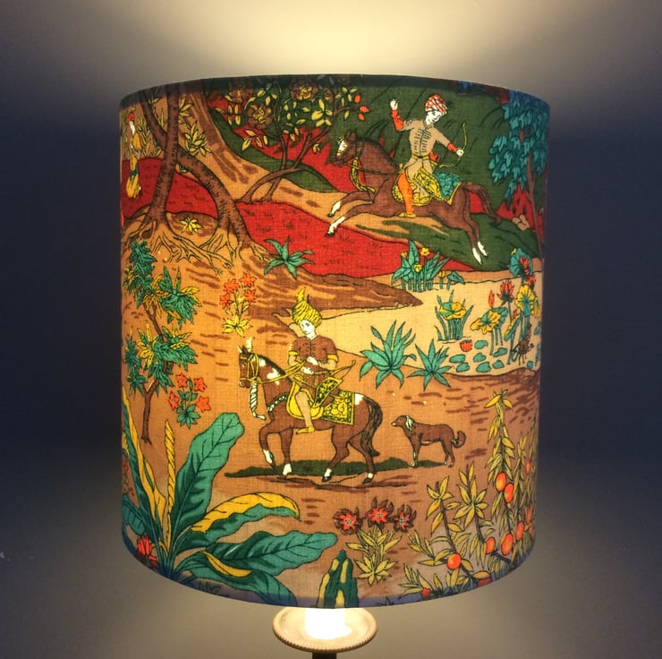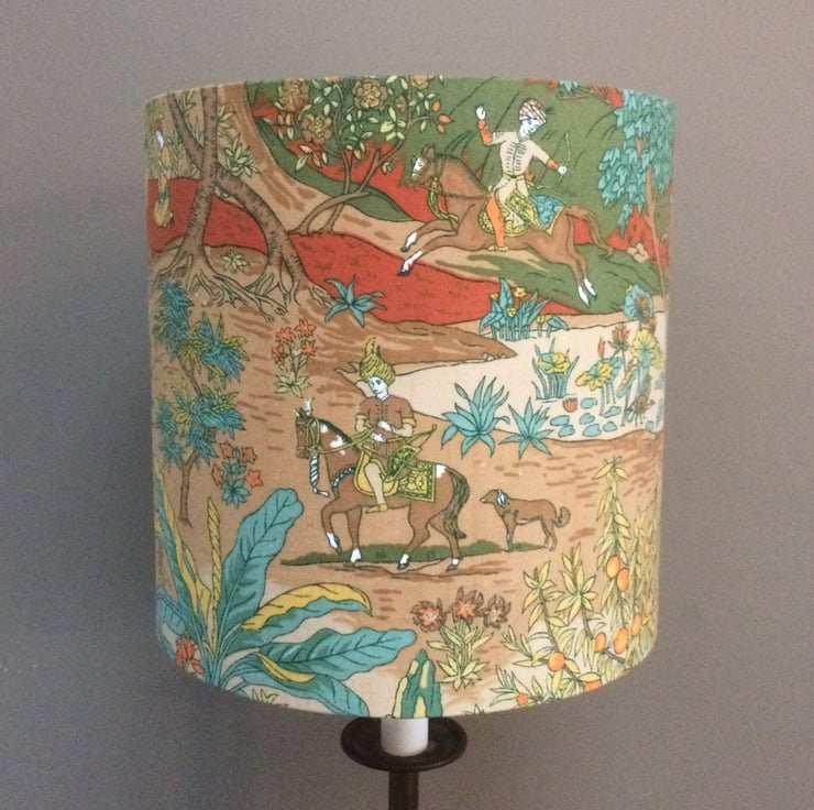 Eastern style Persian Wood with horses and hounds Vintage Fabric Lampshade. Detailed design and this looks great with light though it.