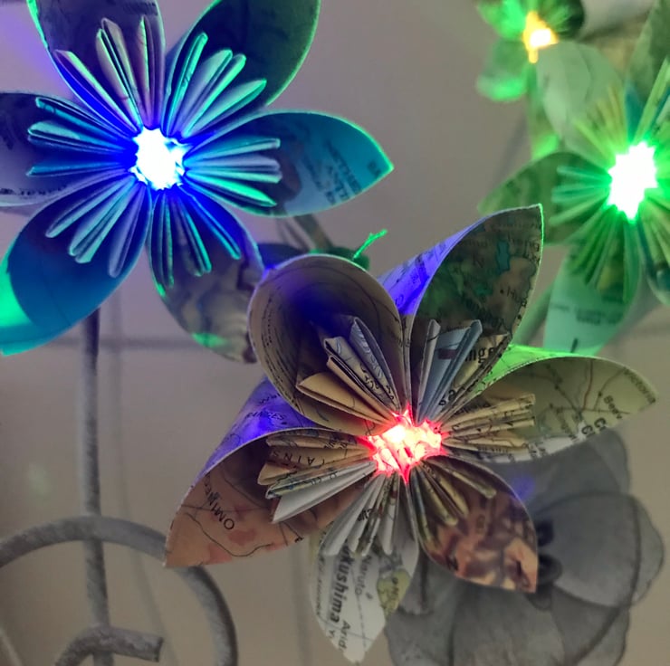 There are 10 paper flower fairy lights which are created and hand folded by me using a recycled world atlas.