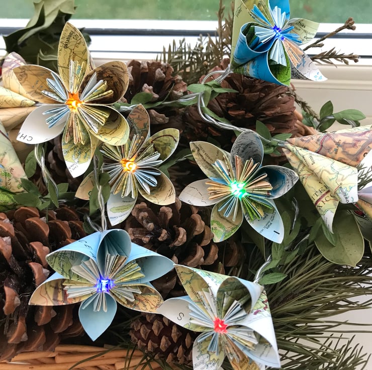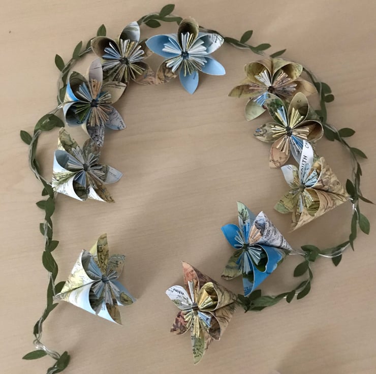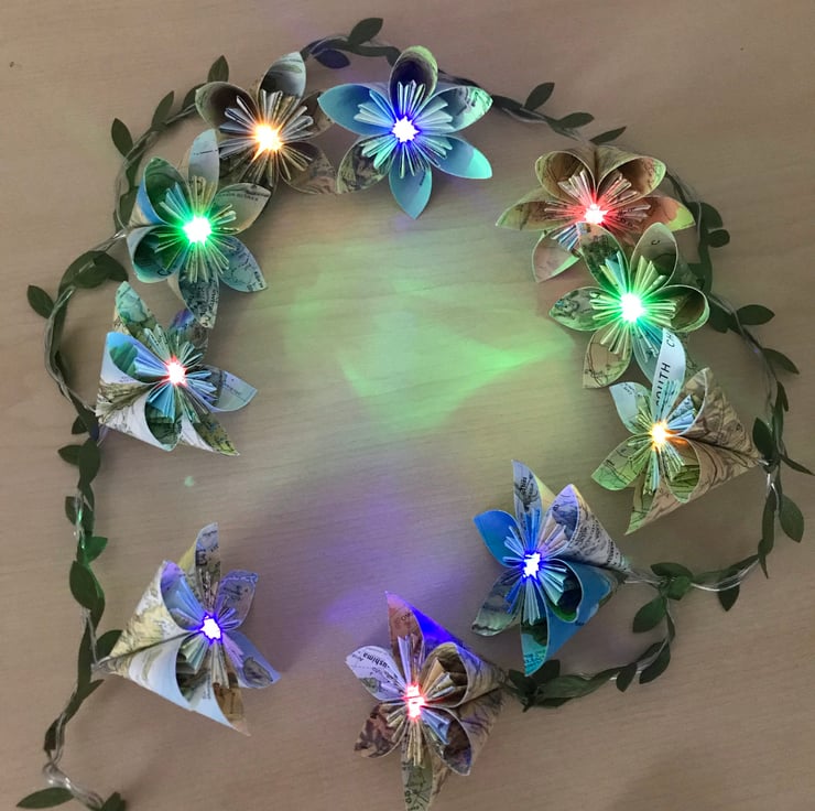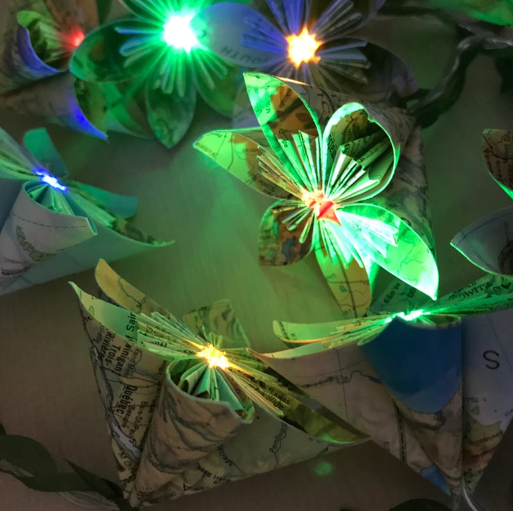 There are 10 paper flower fairy lights which are created and hand folded by me using a recycled world atlas.