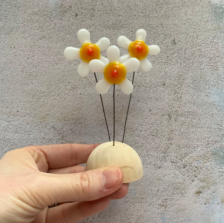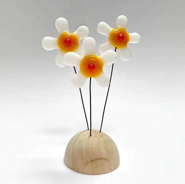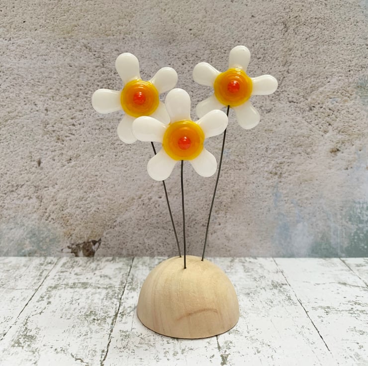 Fused glass freestanding piece on a solid wood base. This dinky sculpture combines white fused glass flowers, a solid wood base and wire stems. This looks lovely either on a window sill or on a mantelpiece. Each sculpture is completely unique.