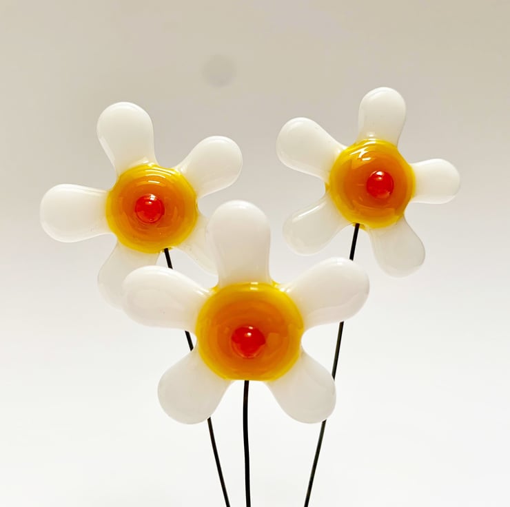 To make it, I used specialist art glass and cut and shaped individual petal and circle shapes from opaque white, yellow and orange art glass. I then carefully arranged them in my the kiln, trapping the wire between the layers. The flowers are fused slowly overnight in my kiln. Once completely cooled, I washed the flowers and glued them securely into the wooden plinth which allows the panel to stand up.