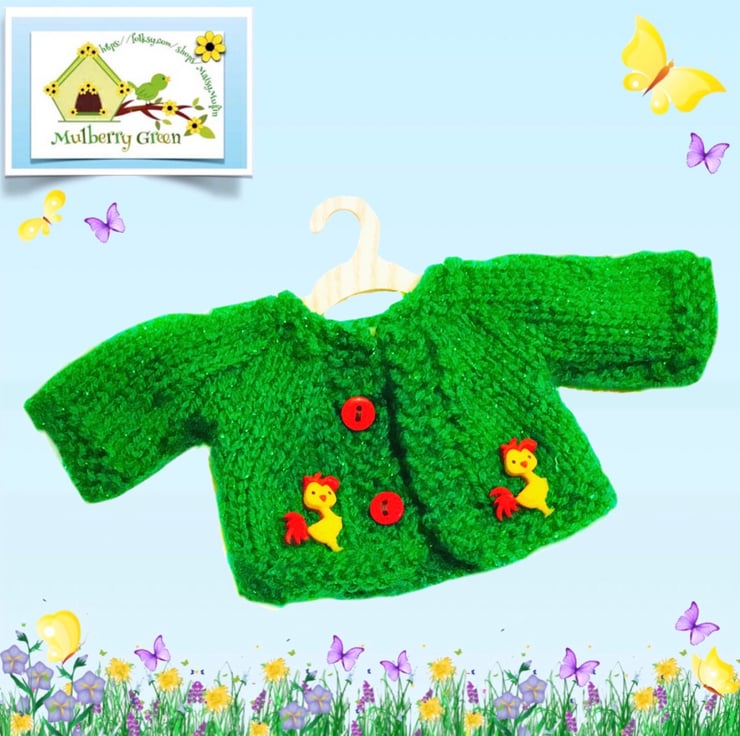 A pretty little green cropped cardigan fit the Mulberry Green characters. The cardigan is hand knitted and is decorated with two little roosters. It comes on a cute little wooden hanger and matches the Farmyard Friends Play Suit..