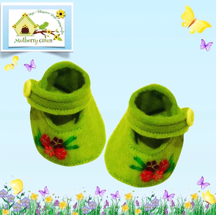 A cute little pair of green shoes, decorated with little red flowers and sequins to fit the Mulberry Green characters. The shoes are hand stitched using double layers of felt and fasten with a popper underneath a little green button.