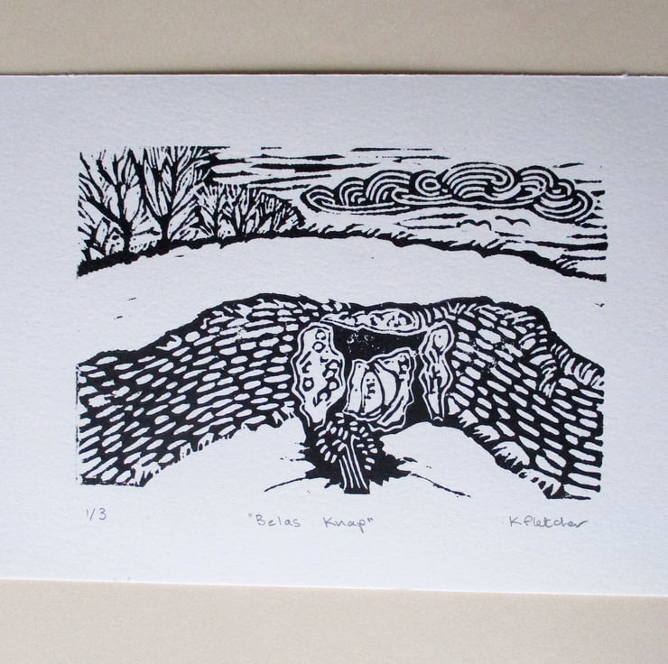 This original hand pressed Linocut Print shows Belas Knap, a Neolithic Long Barrow near Cheltenham, Gloucestershire.