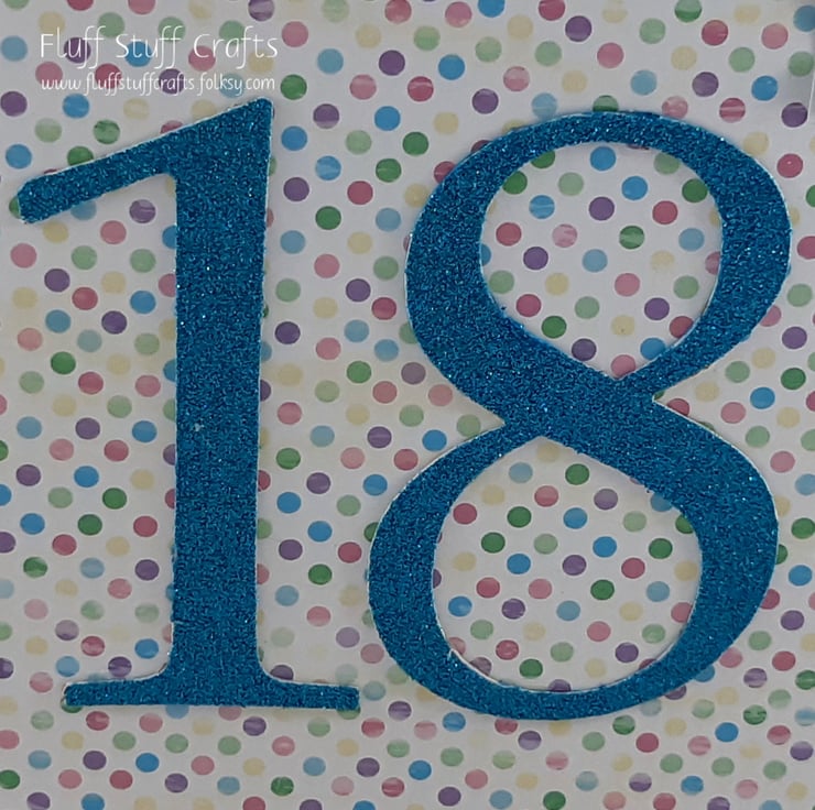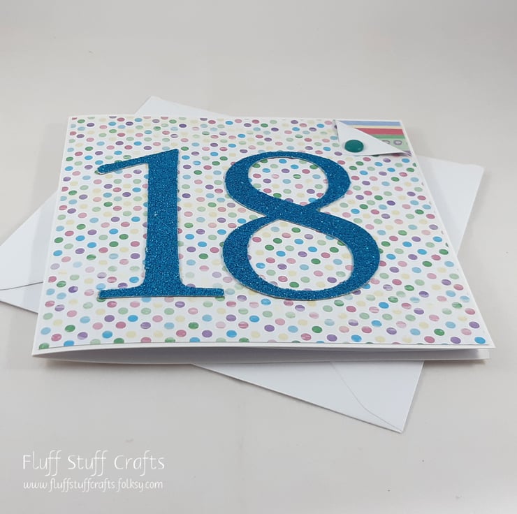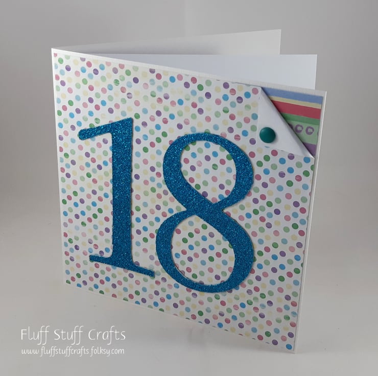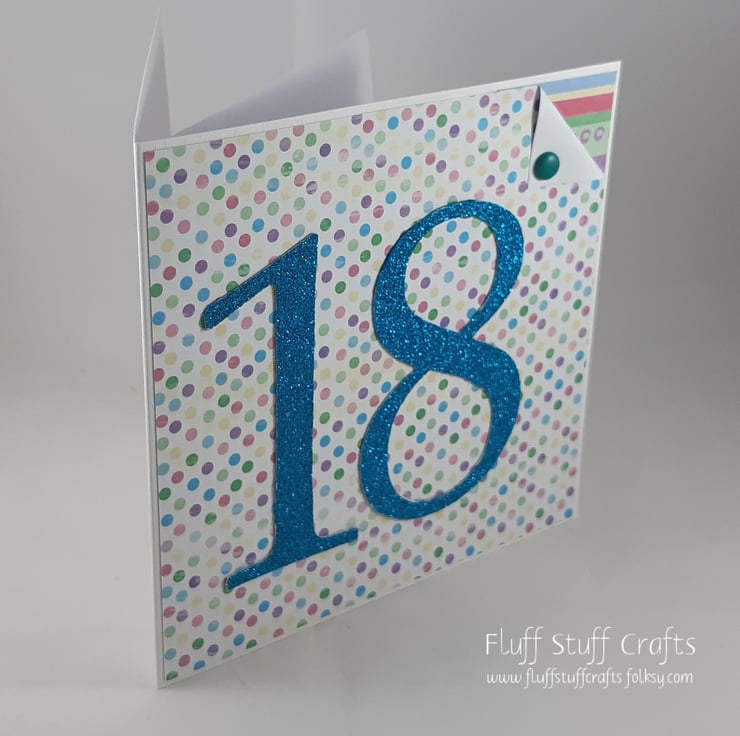 Square 18th birthday card, suitable for boys or girls. The card features a die cut number 18 in teal coloured glitter card, over a multi coloured polka dot background. The corner of the background paper has been folded over and attached using a brad, revealing co-ordinating paper underneath. The insert has been left blank for your own message.