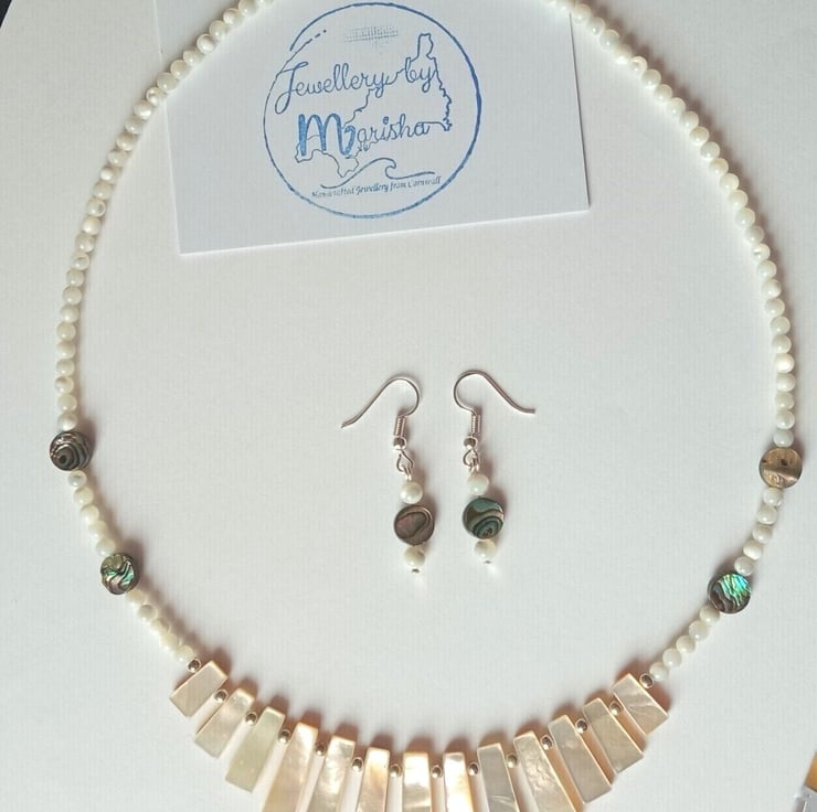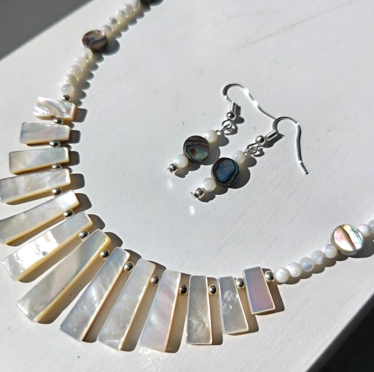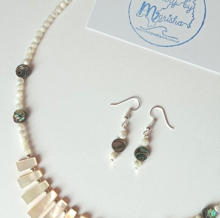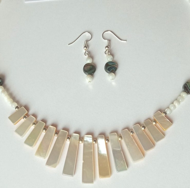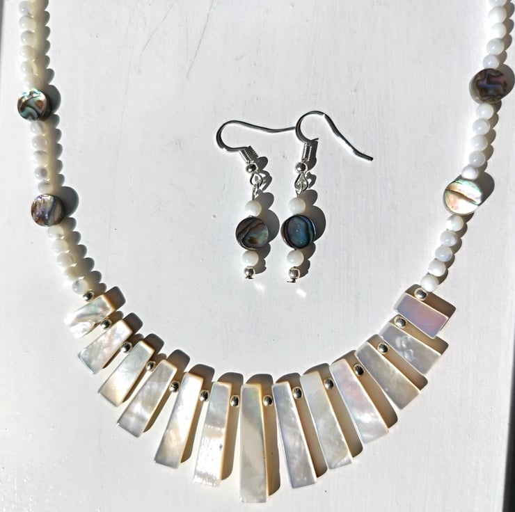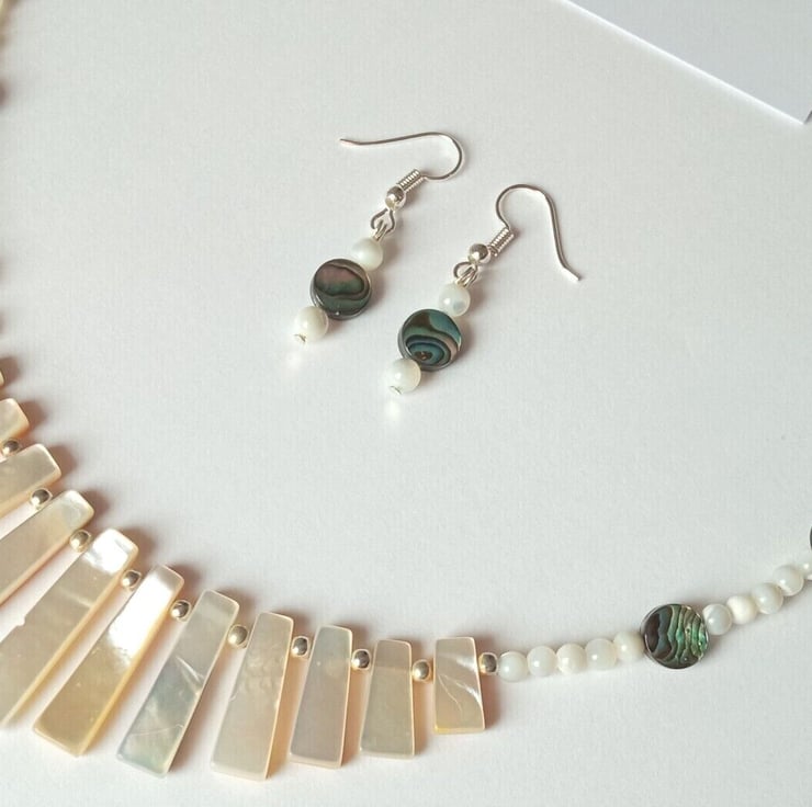 Genuine Mother of Pearl & Rare Paua Abalone Shell Necklace & Earrings Set