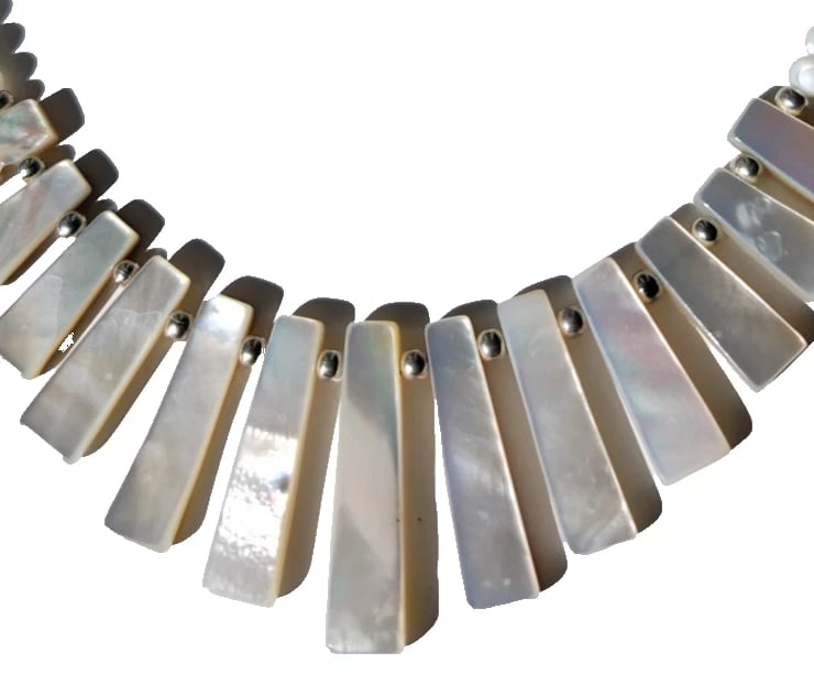 Necklace consists of white mother of pearl beads and natural green coloured abalone or paua shell coin beads and natural coloured mother of pearl tapered detail at the front