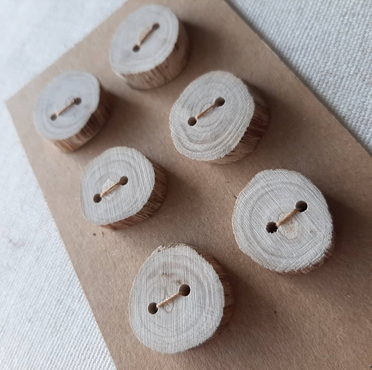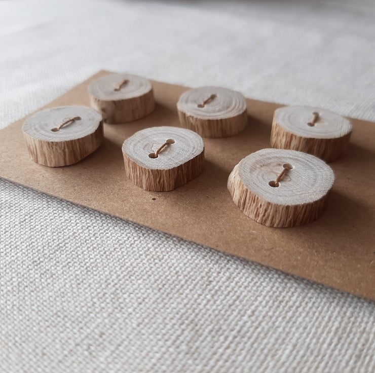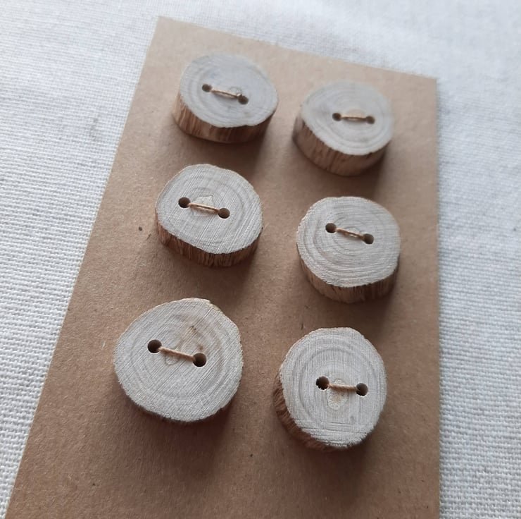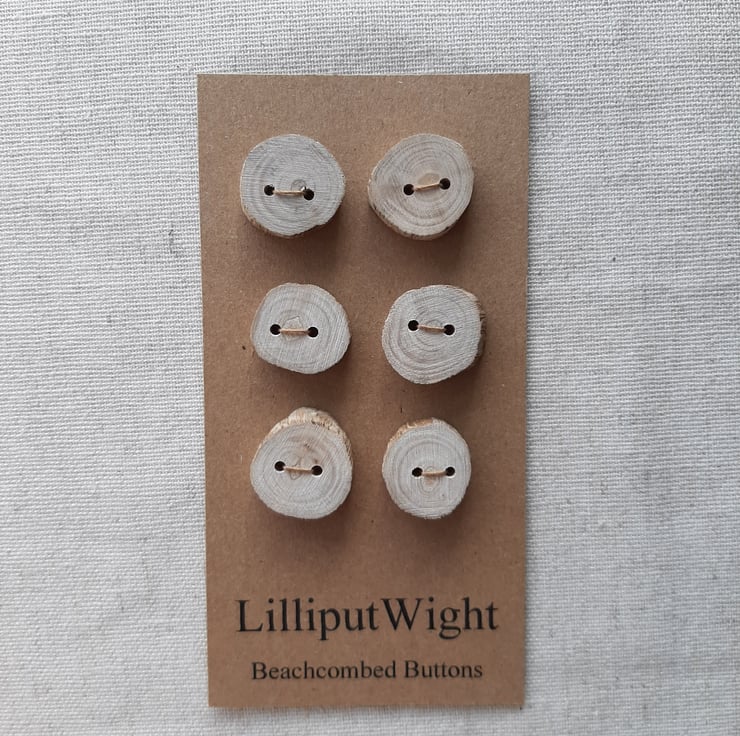 Each button is around 3/4" across and 1/4" thick and has been cut from a single piece of driftwood before being sanded.