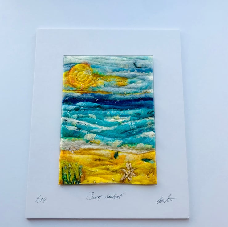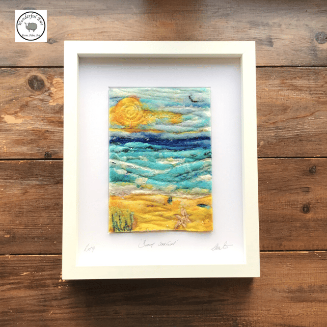 A beautiful picture full of colour and texture. Shades of blue wool highlighted with white silk for the sky and sea, with additional colour added for the sunset. Along with some beautiful sparkly fibres.