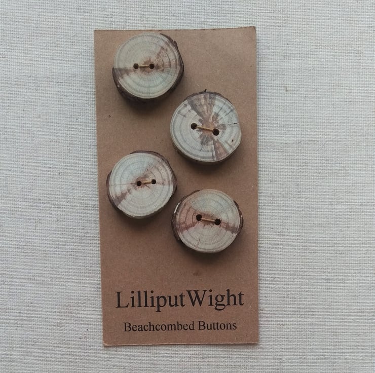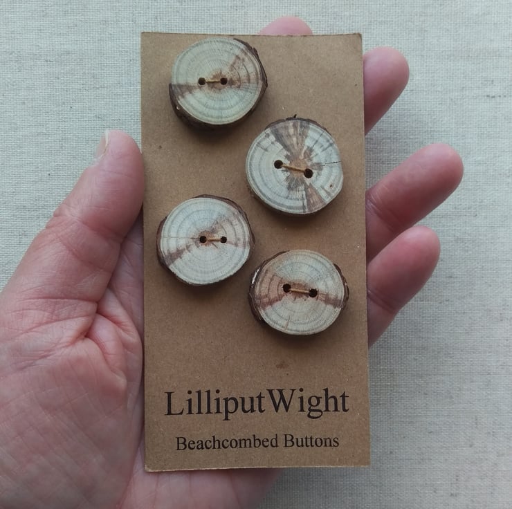 This set of buttons has been handmade by me from driftwood collected from the beach close to my home on the Isle of Wight.