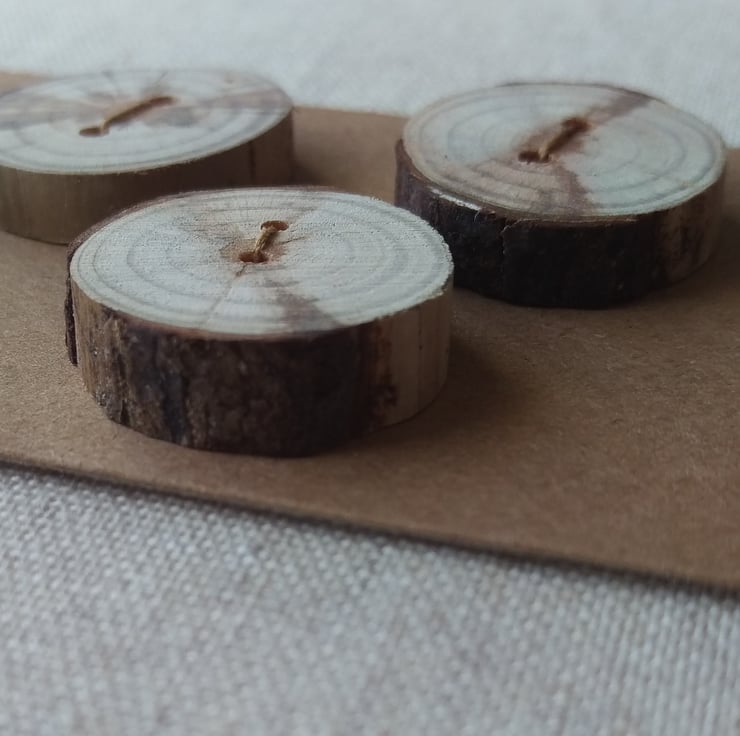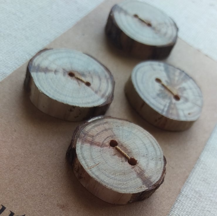Each button is around 1" across and 1/4" thick and has been cut from a single piece of driftwood before being sanded.