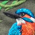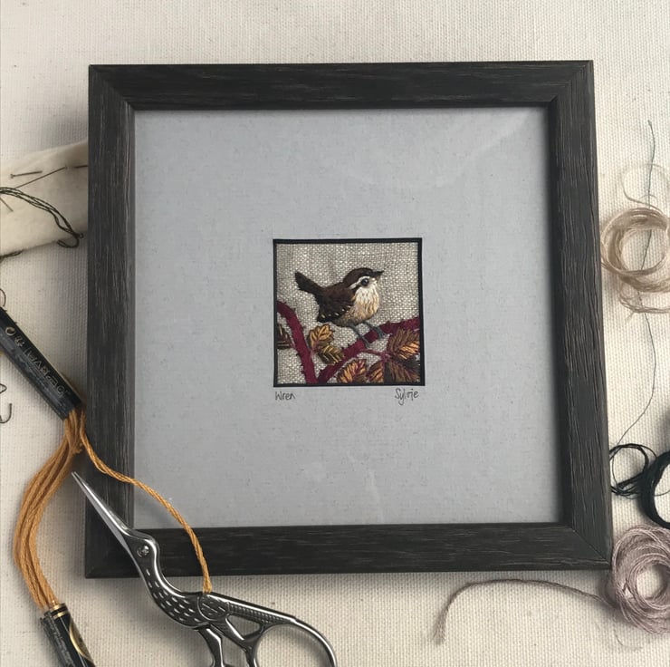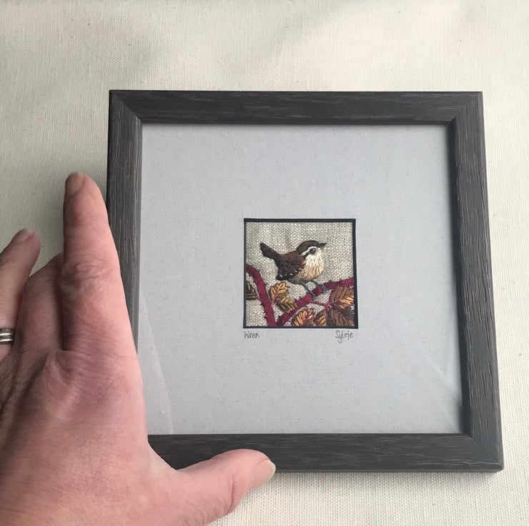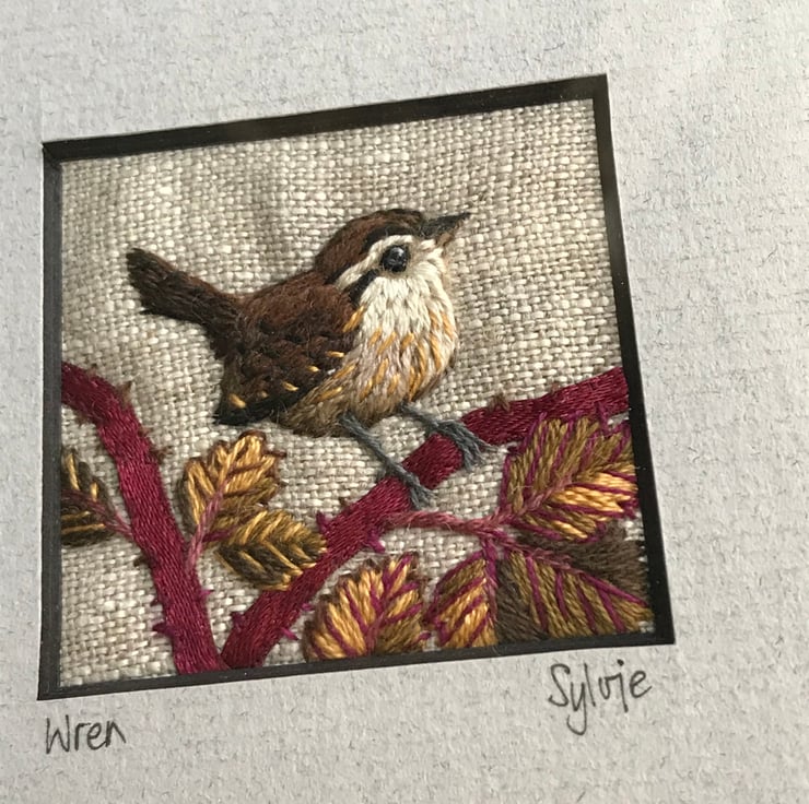 This familiar garden bird was stitched by hand onto a soft cotton background in shades of brown and cream. The bramble branch is formed from a deep red ribbon and the leaves are golden browns. Watch out for those thorns!