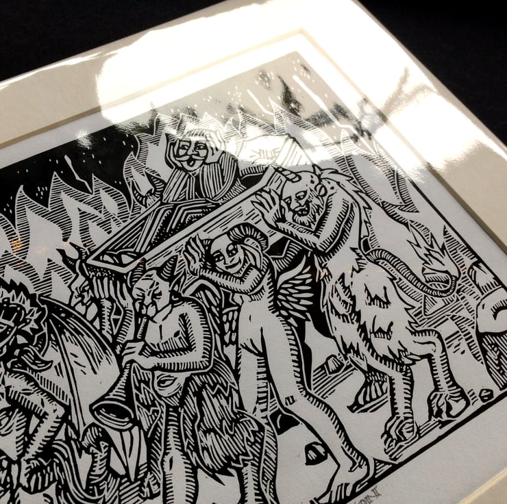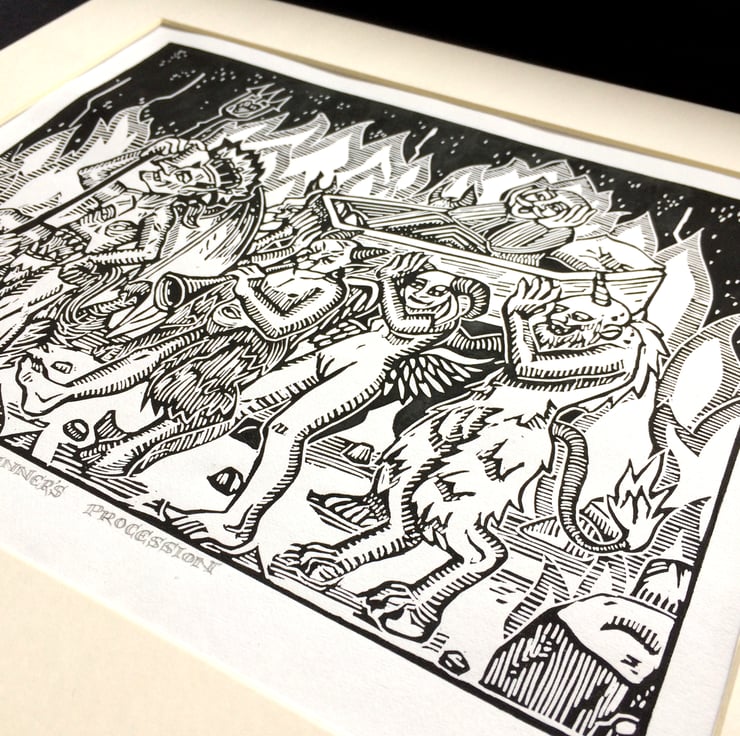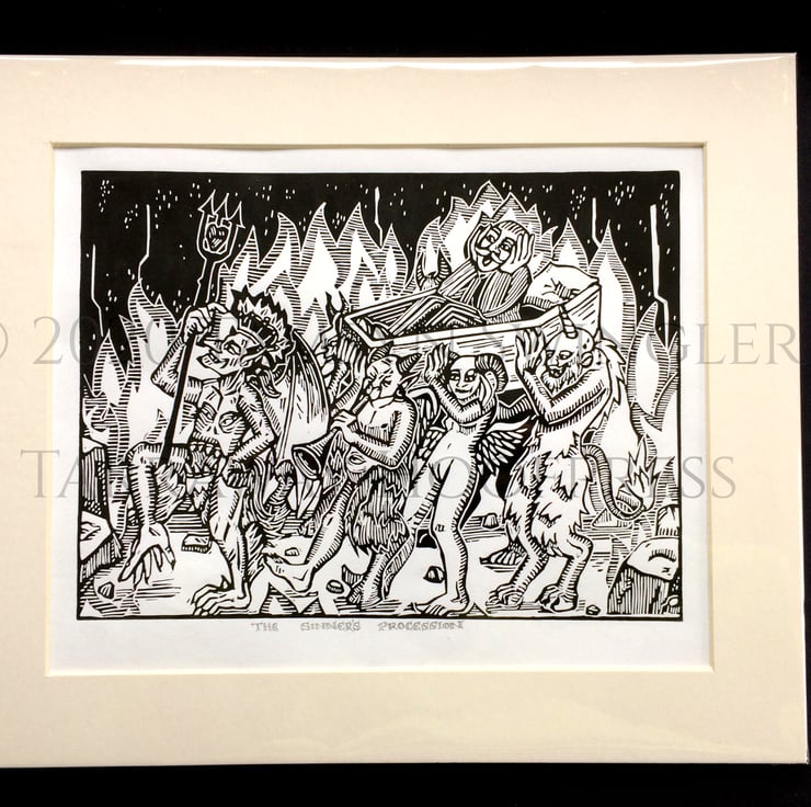 Inspired by the strange demons that appear in Bosche's paintings and the margins of illuminated manuscript, this is a party procession for a newly arrived sinner, who screams in horror at his new abode in the afterlife. The Pall bearers are a mishmash of creatures, who celebrate his arrival with much noise and false pomp.
