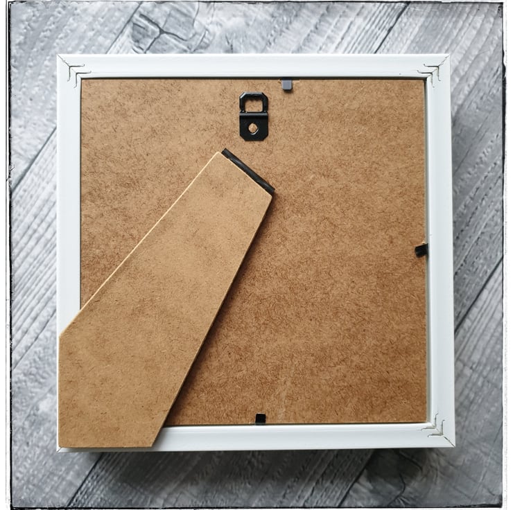 The white frame with glass measures appropriately 17.5cm x 17.5cm. The frame can be hung or displayed on a shelf. All materials are glued on a textured white paper.