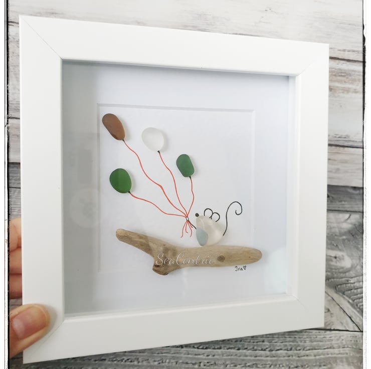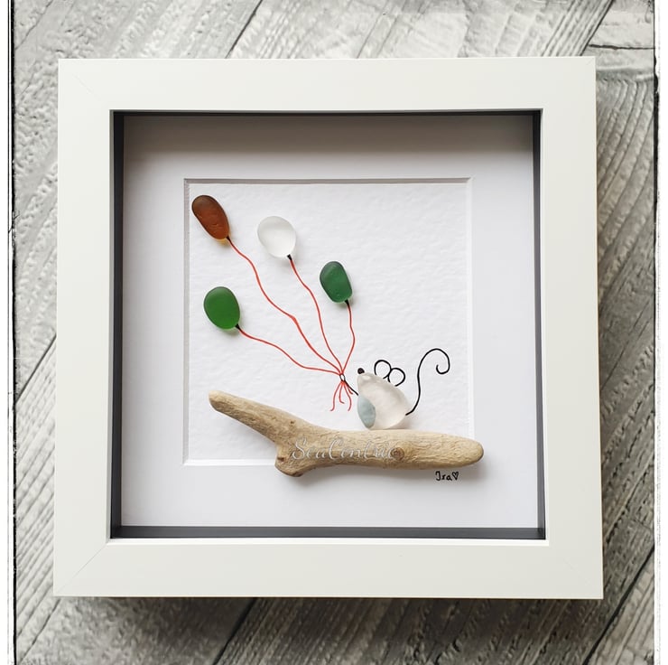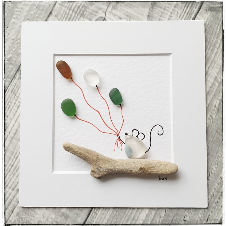 This cute little seaglass mouse flying balloons and standing on a piece of driftwood will make a lovely gift for birthdays or any occasion.
