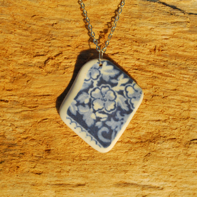 We made this pendant from a large piece of beautiful old transferware we found on the beach. It has come from an old dinner plate, and so is slightly curved. We tumbled the pendant until it was perfectly rounded and smooth. The glaze of the pottery shows tiny cracks which add to the feeling that the piece has a history.