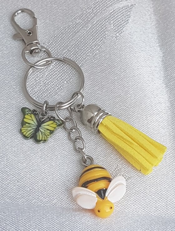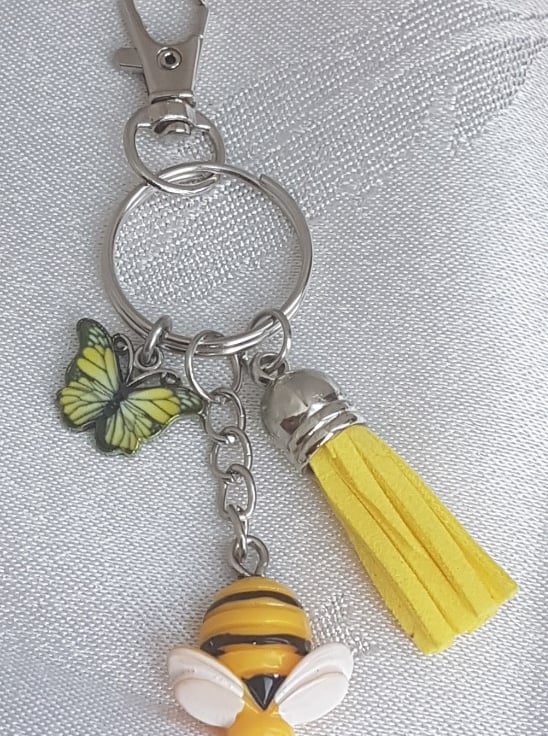 Gorgeous Yellow and Bee Key ring - Key chain Bag charm - Silver Tone.