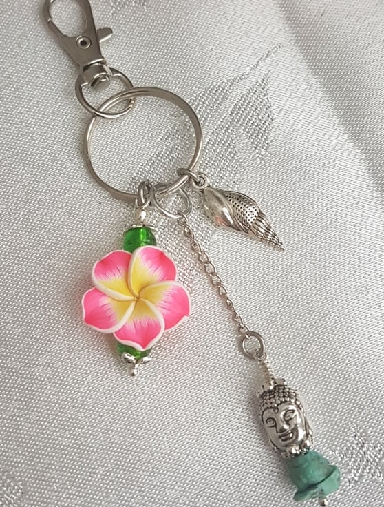 A gorgeous little key ring. A lovely Buddha head bead with Turquoise gemstone chips, a pretty pink flower, representing a beautiful Lotus, and a shell charm representing the Conch shell.