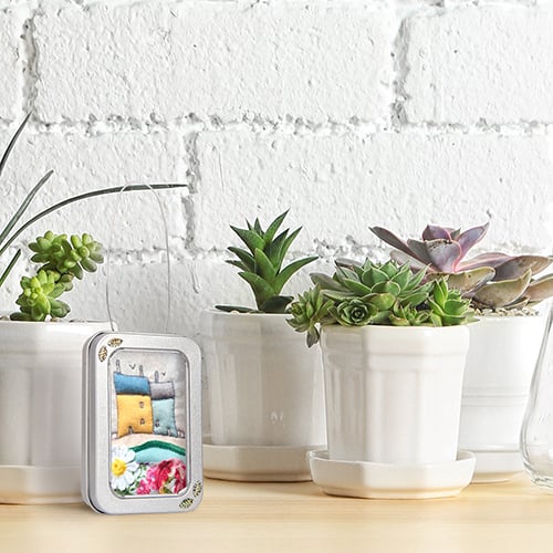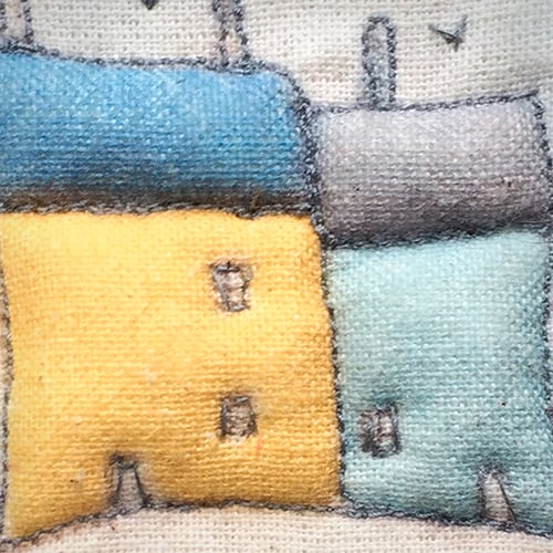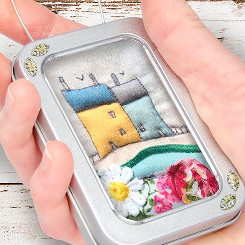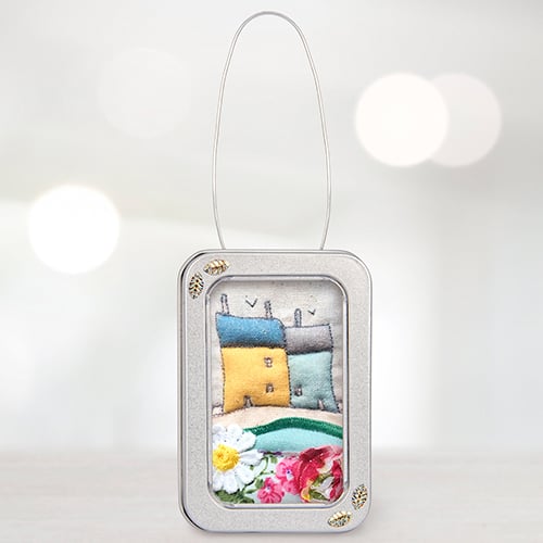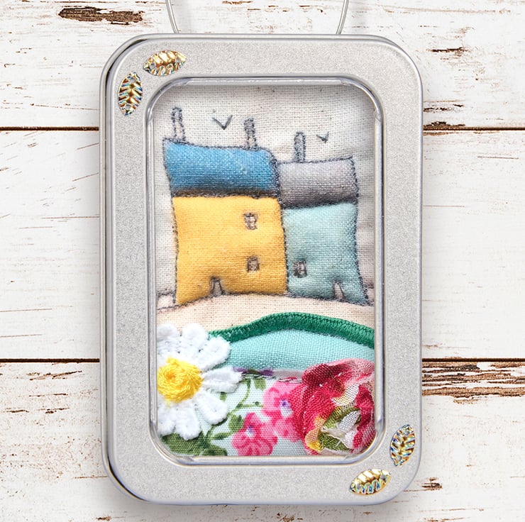 country cottages - hand embellished, textile print, with added fabric & flowers, stitched and framed in a small tin