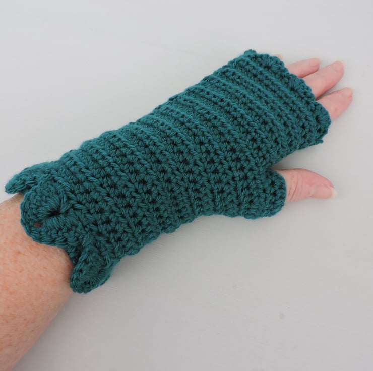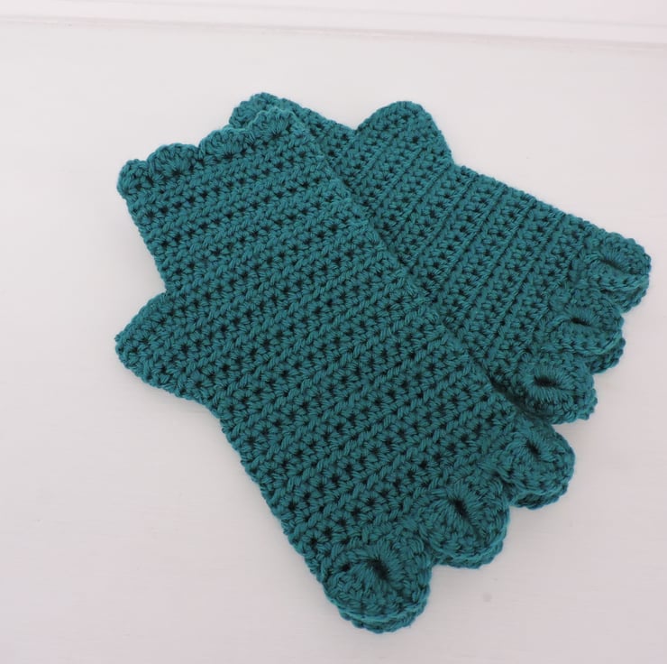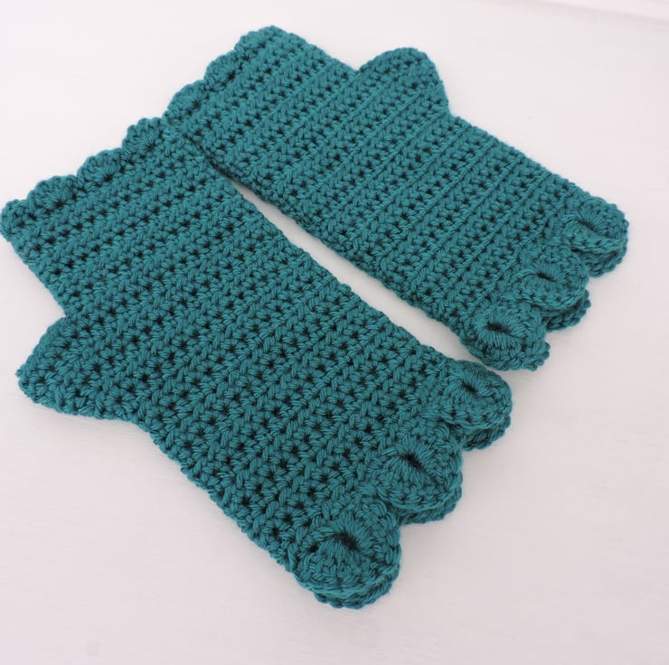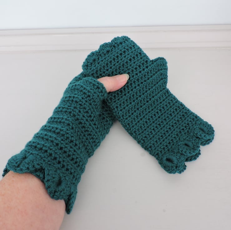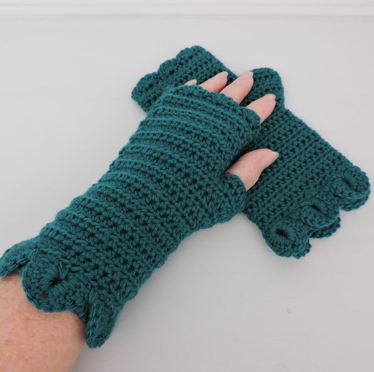 A pair of fingerless mitts which have been crocheted with a 100% premium anti piling acrylic double knit yarn. A gorgeous rich malachite green colour. A single row of dragon scales at the cuffs, a plain body and a wavy edge to the top.. The perfect winter warmer.