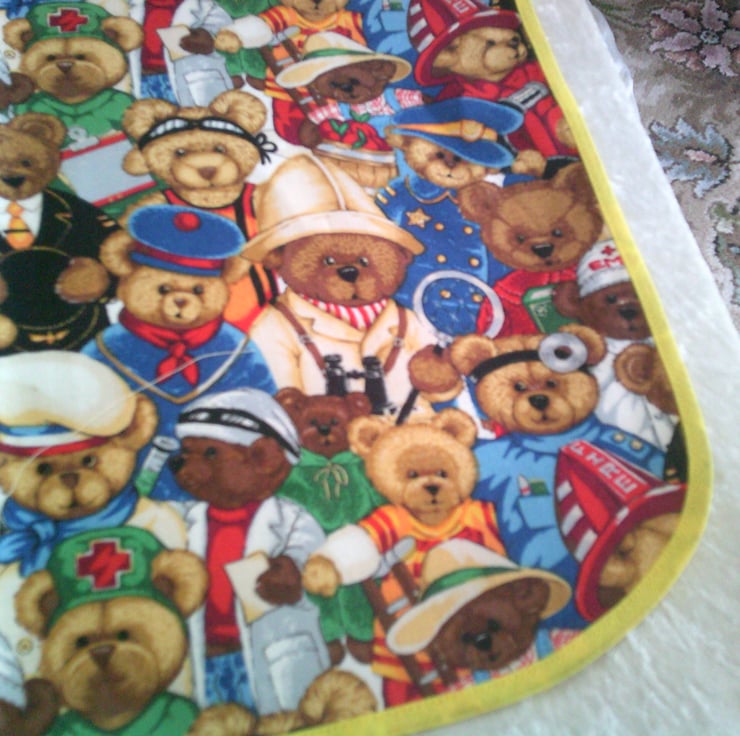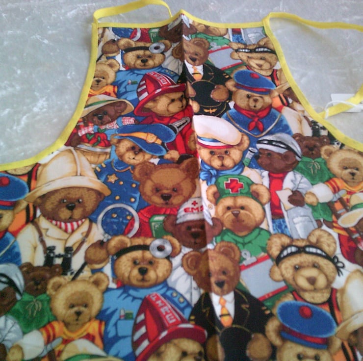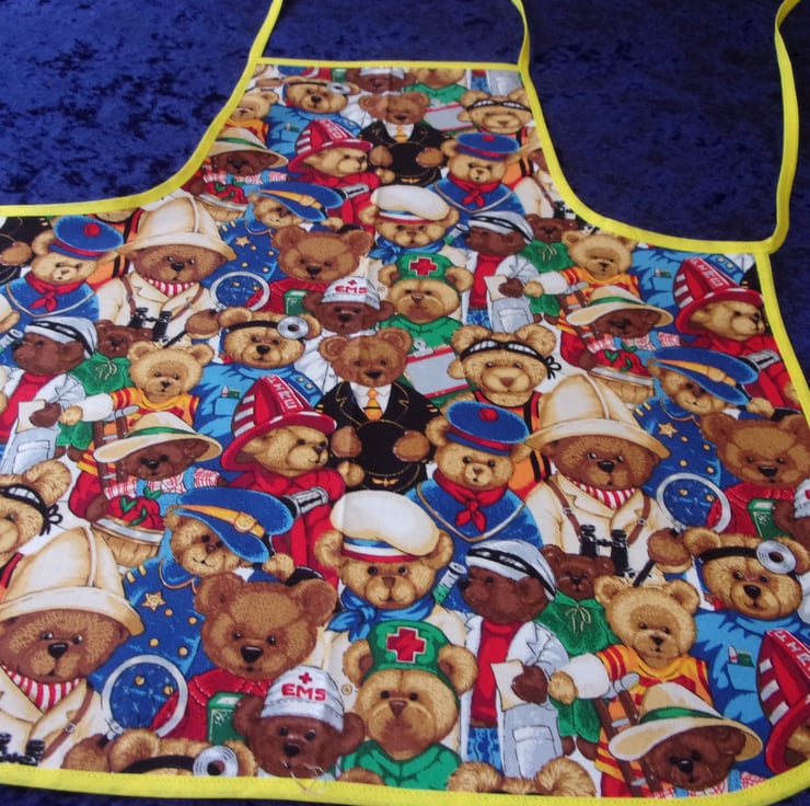The design features Teddy Bears as firefighters, police officers, doctors, nurses, on safari and sailors. The apron is edged with bright yellow bias binding