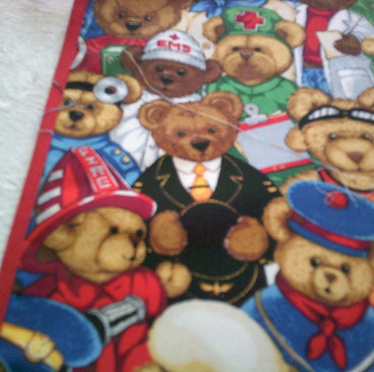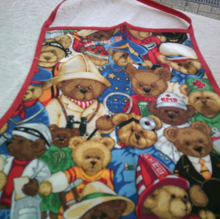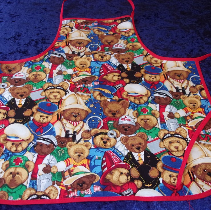 The design features Teddy Bears as firefighters, police officers, doctors, nurses, on safari and sailors. The apron is edged with red bias binding