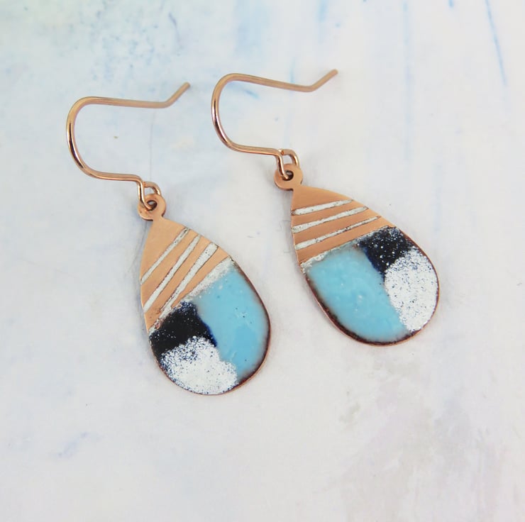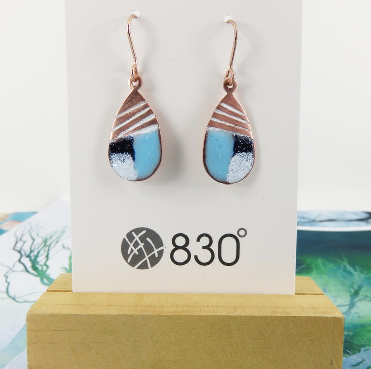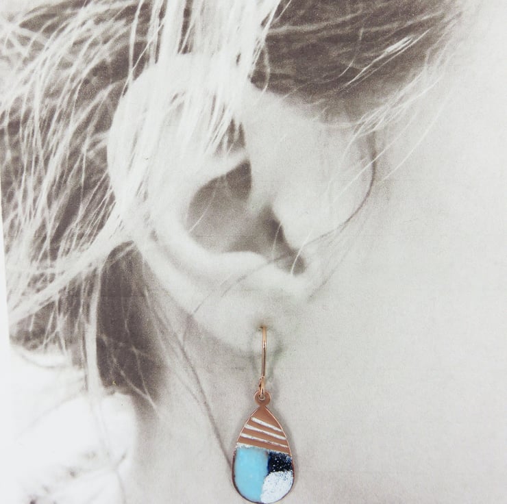 25mm x 12mm teardrop copper dangle earrings decorated with line texture and the bottoms covered in different colour enamels. Hung on rose gold plated earring hooks for pierced ears. Fired in the kiln at 830 degrees.