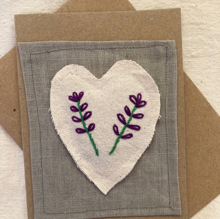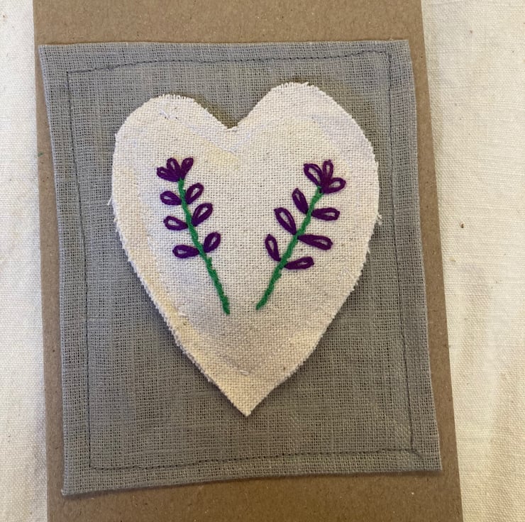 This card has a hand embroidered cream coloured linen heart, which is filled with dried lavender from my garden. The heart has two sprigs of lavender embroidered onto it. The heart has been mounted on natural linen onto a greeting card. The card has been left blank inside for your own message. Card size is 10.5 cm x 15 cm (4" x 6") and comes with a matching envelope.
