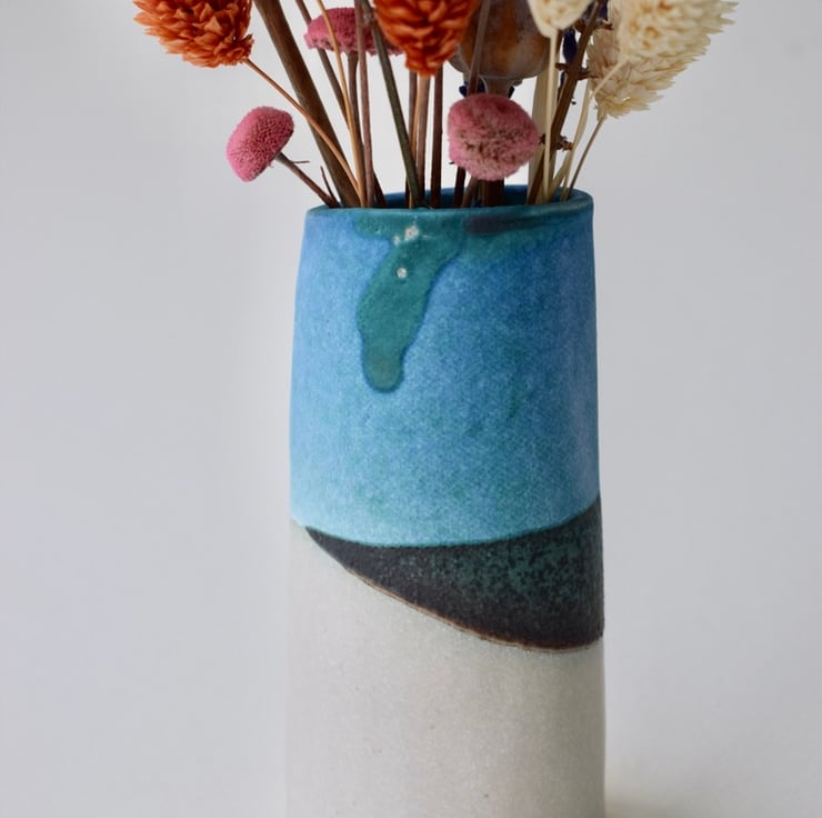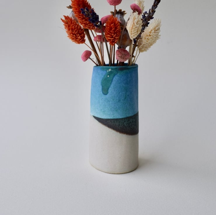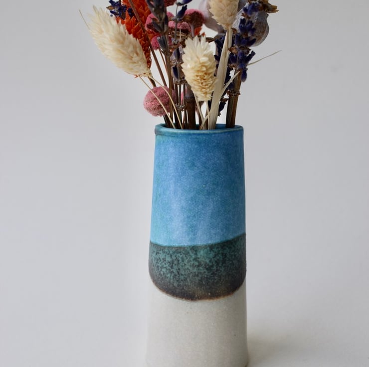 A beautiful little vase for a delicate posy of fresh flowers. This small stoneware ceramic vase is both functional and decorative, it will hold water for flowers or herbs having a shiny glaze on the inside.