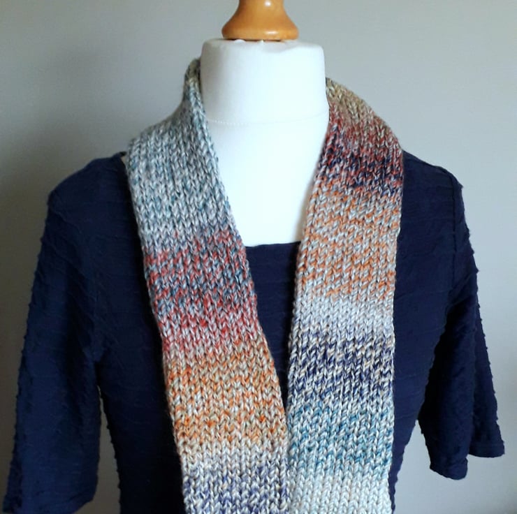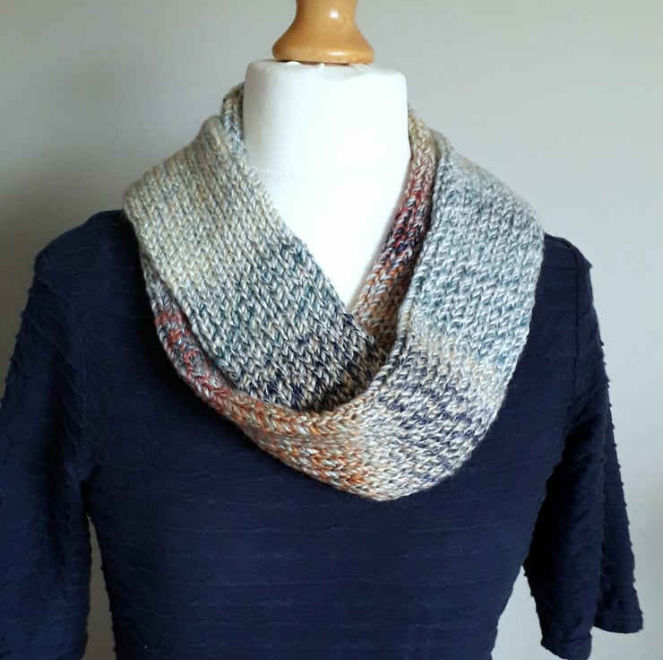 This infinity scarf has been knitted from beautifully soft acrylic yarn in a variety of subtle colours which combine to create a marbled effect. It is double thickness and will help you to keep you really warm and cosy.
