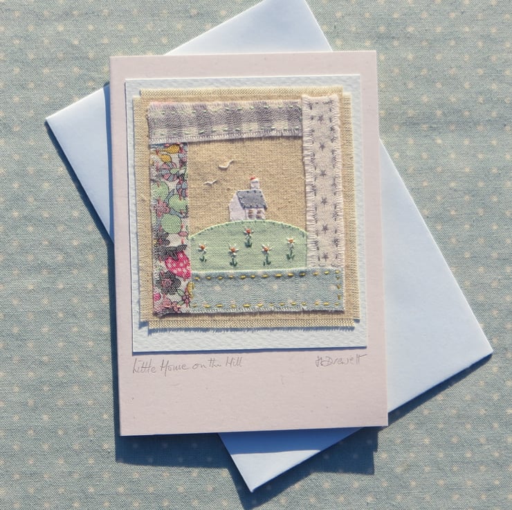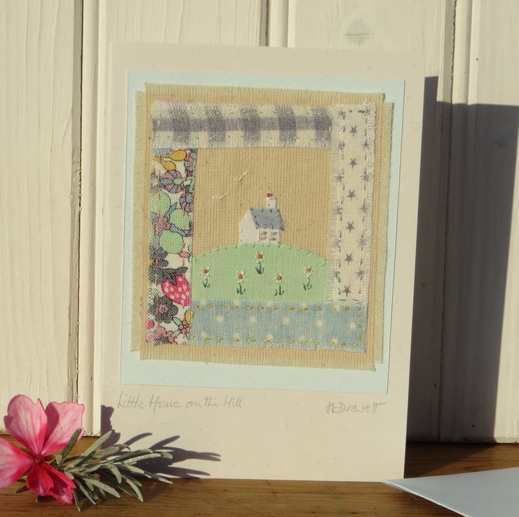 This is a small hand-stitched textile mounted onto a greeting card. I have hand-stitched everything with care and used a pretty cotton prints for the border. The miniature applique is made with my own hand-dyed recycled cotton fabrics with finely embroidered details.